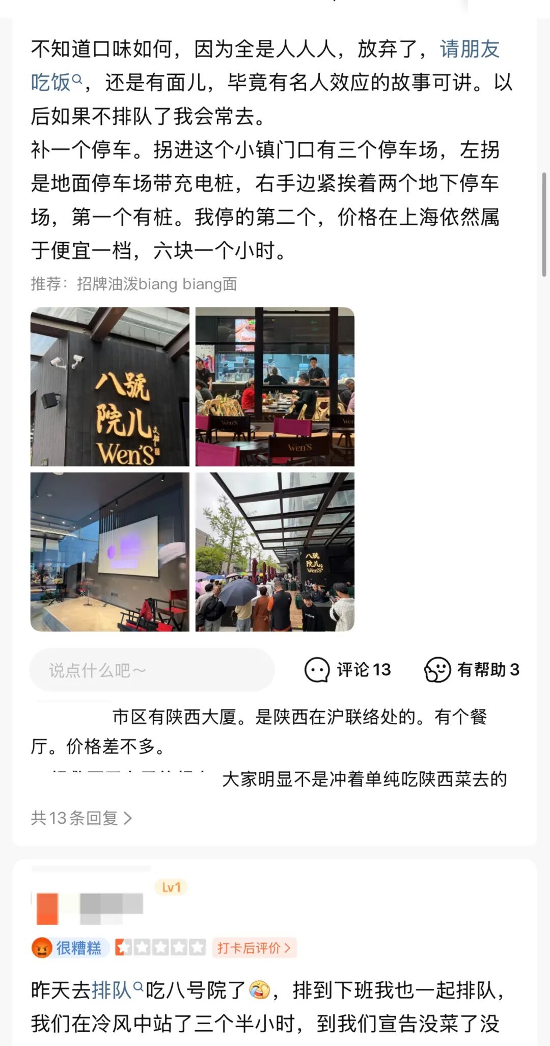 有人五星好评,夸“在上海能吃到这个价位这个水准的陕西面已算合格”;也有人一星差评,骂“等了四个小时连肉夹馍都没抢到”。