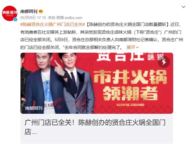 2023年,陈赫创办的贤合庄火锅店广州门店关闭