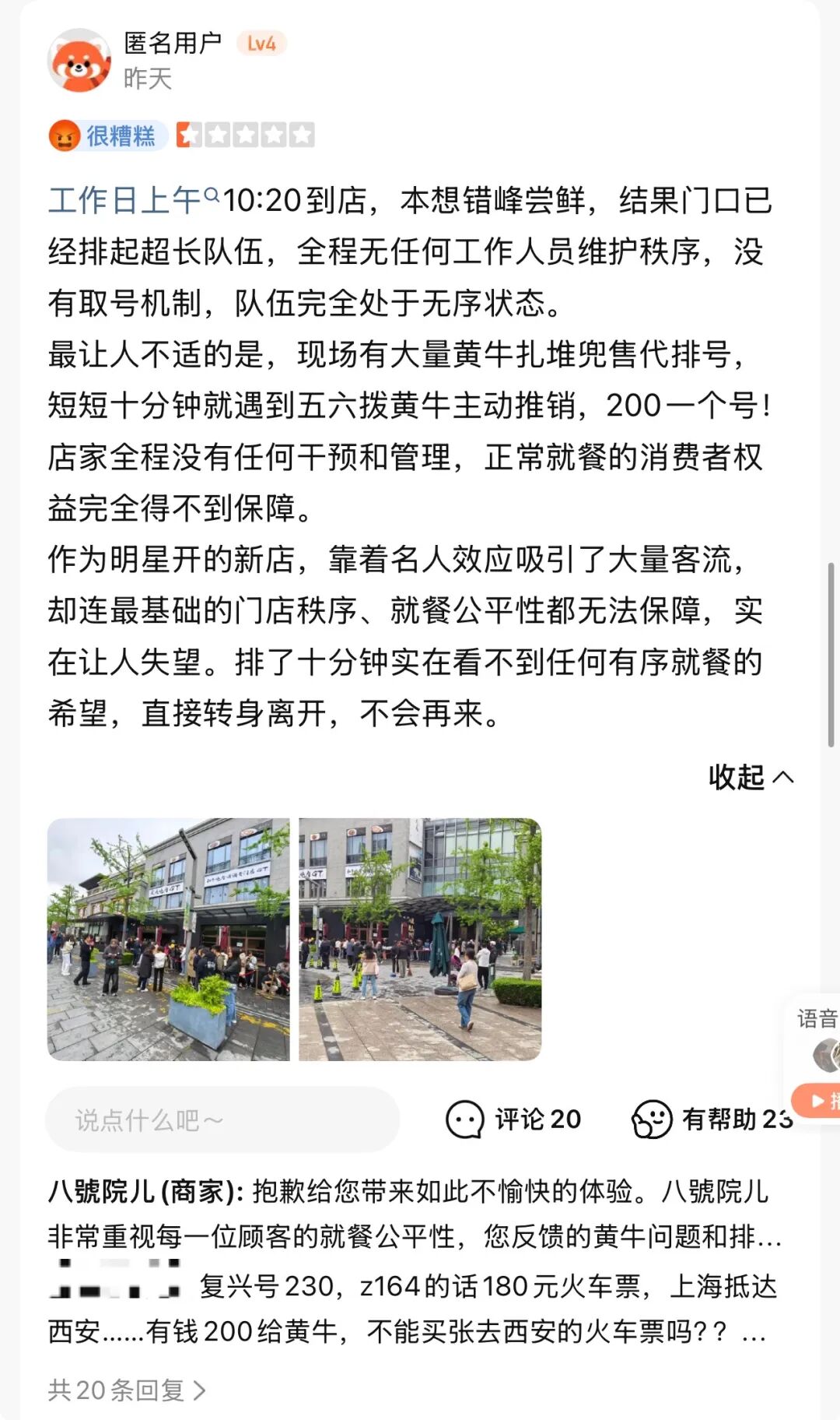 还有一条差评,读起来更扎心。一位网友在冷风里站了三个半小时,轮到自己的时候被告知食材售罄,气得在评论区质问:“明星开的店,就可以糟践大家的时间吗?”