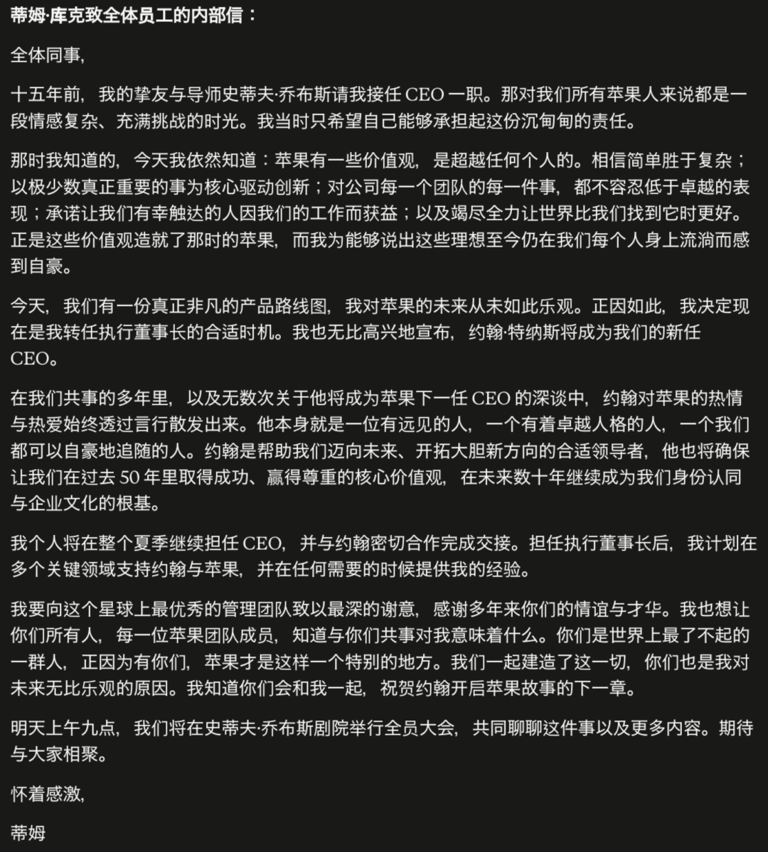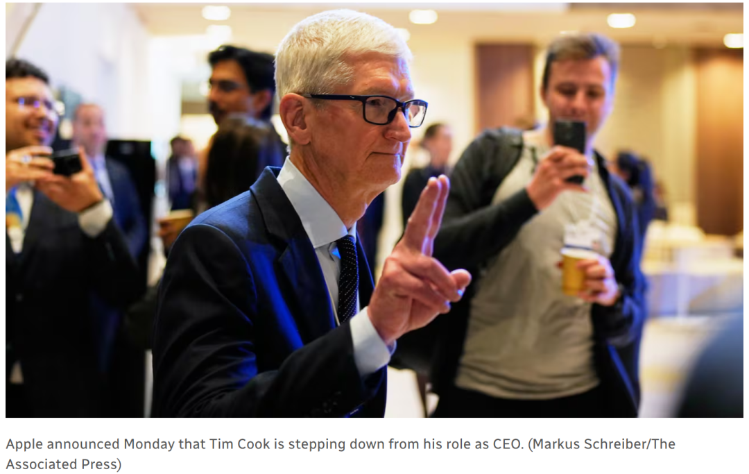 就在刚刚,苹果突然官宣:CEO蒂姆·库克(Tim Cook),卸任了。