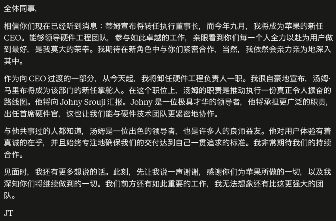 特努斯自己也发了封内部信。他写道:“领导硬件工程团队、亲眼看到每一个人全力以赴为用户做到最好,是我莫大的荣幸。”末尾他还加了一句“我依然会亲力亲为地深入其中”。