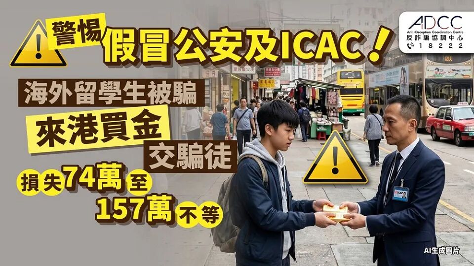 香港警方近日接获至少9宗假冒官员的诈骗案件,骗徒先后假冒上海公安局及香港廉政公署人员,联络正在海外就读的留学生,诱骗他们前往香港购买金粒,再亲身将金粒交予骗徒。