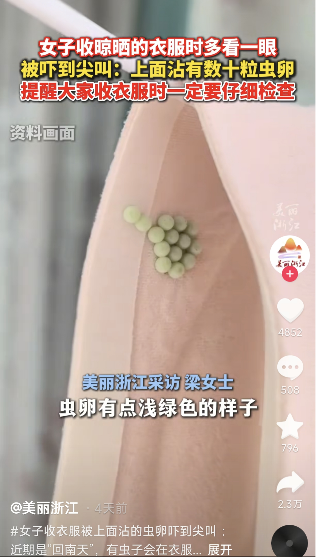 晾晒在阳台的衣物、毛巾质地柔软,潮湿度刚好,又带着淡淡芳香,便会吸引荔蝽在上面产卵。