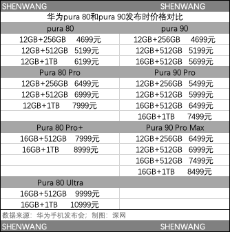 与上一代Pura80系列相比,华为Pura90标准版起售价4699元起,与上一代相比“加量不加价”;Pura 90 Pro系列的起售价5499元,比上一代降价了1000元。