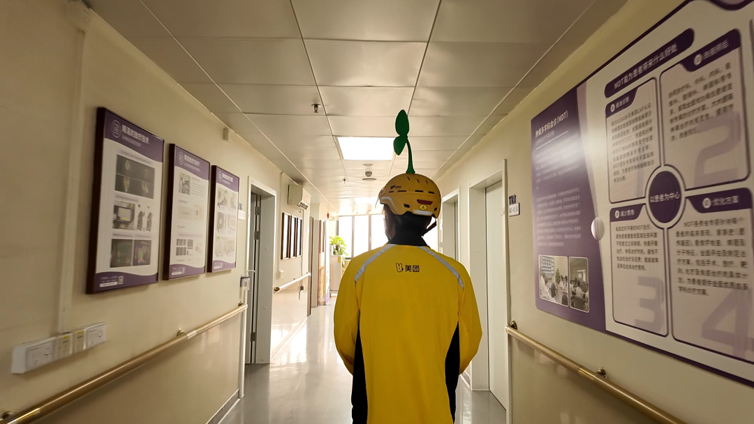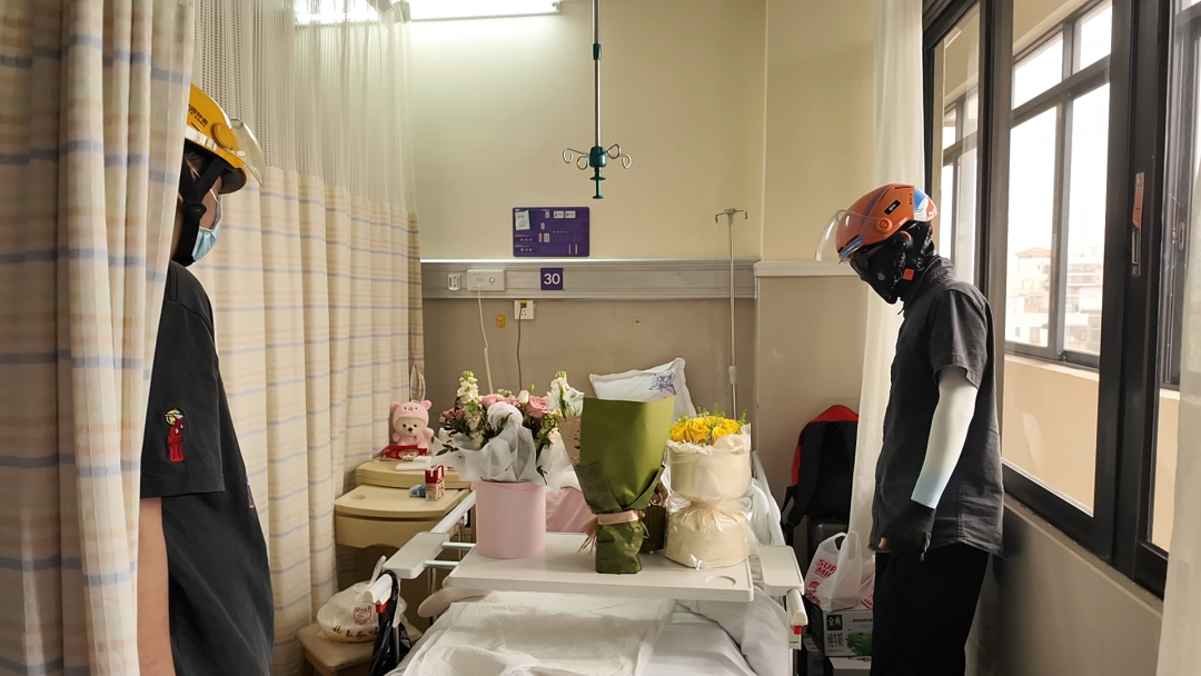 大家轮流带着牛奶、水果、鲜花来到小黎的病床前,在小黎状态好的时候陪她聊天、打气,更多的时候小黎都在睡觉,骑手们便悄悄进入病房,放下礼物,远远地看一眼,便匆匆离去,继续工作。