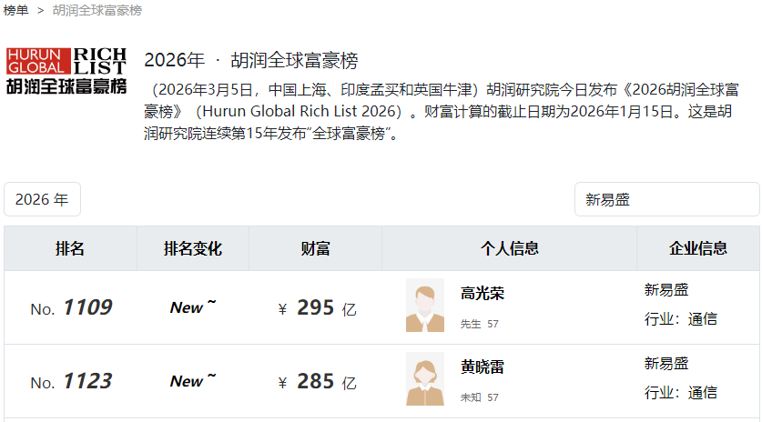 公开资料显示,1969年,高光荣出生于四川乐山,中专毕业。1989年,高光荣加入乐山无线电厂光通信分厂,成为一名普通技术员。 2008年,39岁的高光荣再次创业,创立了新易盛。据2026年胡润全球富豪榜,新易盛实控人高光荣、黄晓雷财富值分别为295亿元、285亿元,排名分别为1109位、1123位。