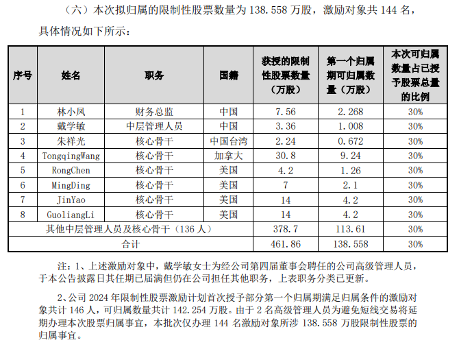 今日,A股三大指数走强,沪指收复4100点,深成指涨1.3%,创业板指涨1.7%。 CPO概念股集体拉升,光模块龙头新易盛(300502.SZ)盘中股价创历史新高,达625元/股;截至收盘,涨7.64%,报622.7元/股;市值6190亿元,成为成都第一家市值超6000亿元的公司。 今年以来,新易盛涨幅超过40%;自去年4月21日至今,公司累计涨超1000%。 截至2025年9月30日,新易盛股东人数为15.53万;其中,通过激励拿到股权的百余名新易盛员工,或朝着“千万富豪”的方向前进。 公开资料显示,新易盛2008年成立于成都,2010年被认证为国家高新技术企业,主要业务为研发、生产和销售多种类的高性能光模块和光器件,产品可广泛应用于数据中心、电信网络(FTTx、LTE和传输)、安全监控以及智能电网等ICT行业。 公司公告显示,2024年,新易盛通过了限制性股票激励计划,激励对象共146人,包括公司副总经理、董秘、财务总监等,以及136名未具名的中层管理及核心骨干(激励股权占比约67.6%)。经过调整,该激励计划股权数量共560万股(包含85.82万股预留股权),归属价格约16.17元/股。 按照625元/股的最高股价计算,这部分股票对应市值高达35亿元,上述136名不具名员工对应股权市值超23亿元,平均每人超1700万元。 该计划分3个归属期,业绩考核年度为2024年至2026年:第一个归属期,要求公司2024年营收不低于45亿元;第二个归属期,要求公司2024至2025年营收累计值不低于110亿元;第三个归属期,要求公司2024至2026年营收累计值不低于195亿元。 2024年,新易盛实现营收86.47亿元,第一个归属期目标达成。公告显示,第一个归属期为2025年1月20日至2026年1月16日;对应股票已于2025年7月、2025年12月,分两次上市流通,合计约142.25万股。 此外,公司还对41名员工进行了预留股权激励,第一个归属期为2025年8月28日至2026年8月27日,2025年9月上市流通,股权数量为25.75万股。 仍以625元/股计算,被激励员工已经到手的股票市值超过了10亿元,去除16.17元/股的归属价格,浮盈仍超过10亿元。第一批受到激励的136名不具名员工,平均浮盈或超500万元;预留股权激励的41名员工,平均浮盈或超380万元。 新易盛2025年三季报显示,公司营收达165亿元,净利润63亿元,已经超过了第二个归属期设置的目标。另据公司2025年年报,预计公司净利润为94亿元至99亿元,同比增长231.24%至248.86%,全年营收大概率将同比大幅增加。 另一方面,新易盛实控人的身家也水涨船高。