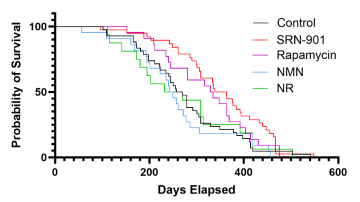 此次试验耗时数年,以18月龄(约相当于人类50多岁)自然衰老的正常小鼠为研究对象,持续观察至其自然死亡。结果显示,接受SRN-901治疗的小鼠中位剩余寿命延长33%,死亡风险降低46%。
