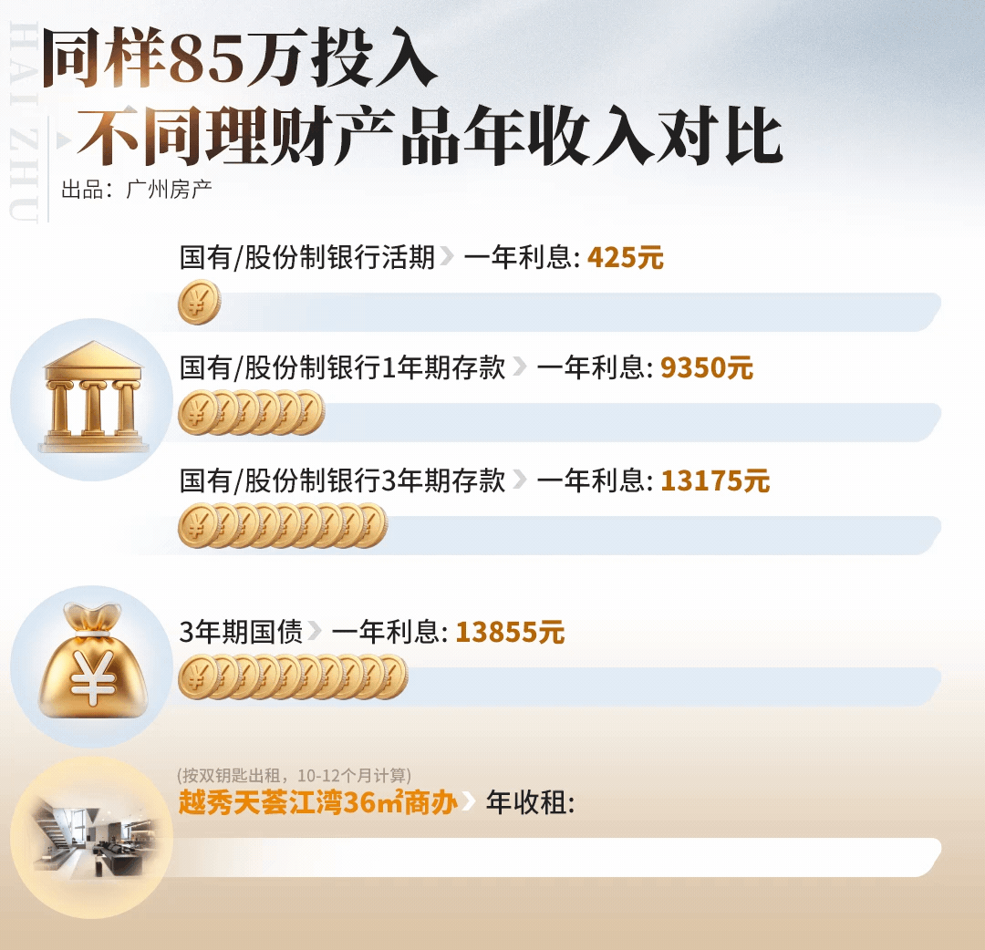 硬实力说话:它是海珠区唯一在售的小面积江岸商办。海珠不缺公寓,但缺能走到江边的公寓,而天荟江湾200米到江,楼下是滨江公园——这才是竞标机构看中的硬资产。