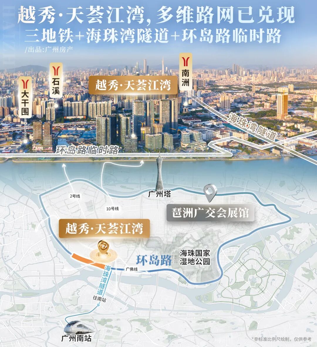 海珠湾隧道也于25年11月通车,一脚油门到南站,不到20分钟。环岛路临时段直通楼下岭南海港汇,未来直达琶洲西区、广交会。