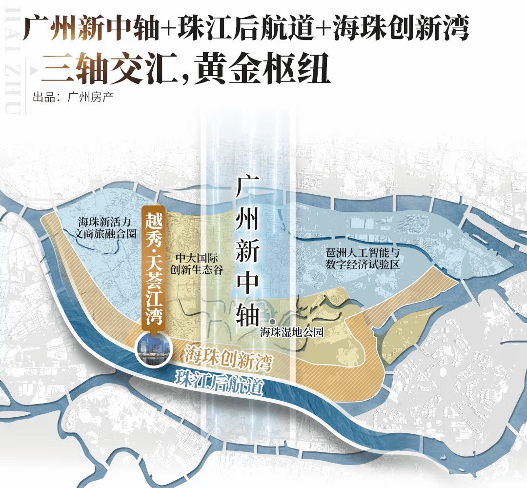 这种确定性,首先体现在越秀·天荟江湾区位的含金量——它是珠江后航道、广州新中轴南段、海珠创新湾的三轴交汇点。