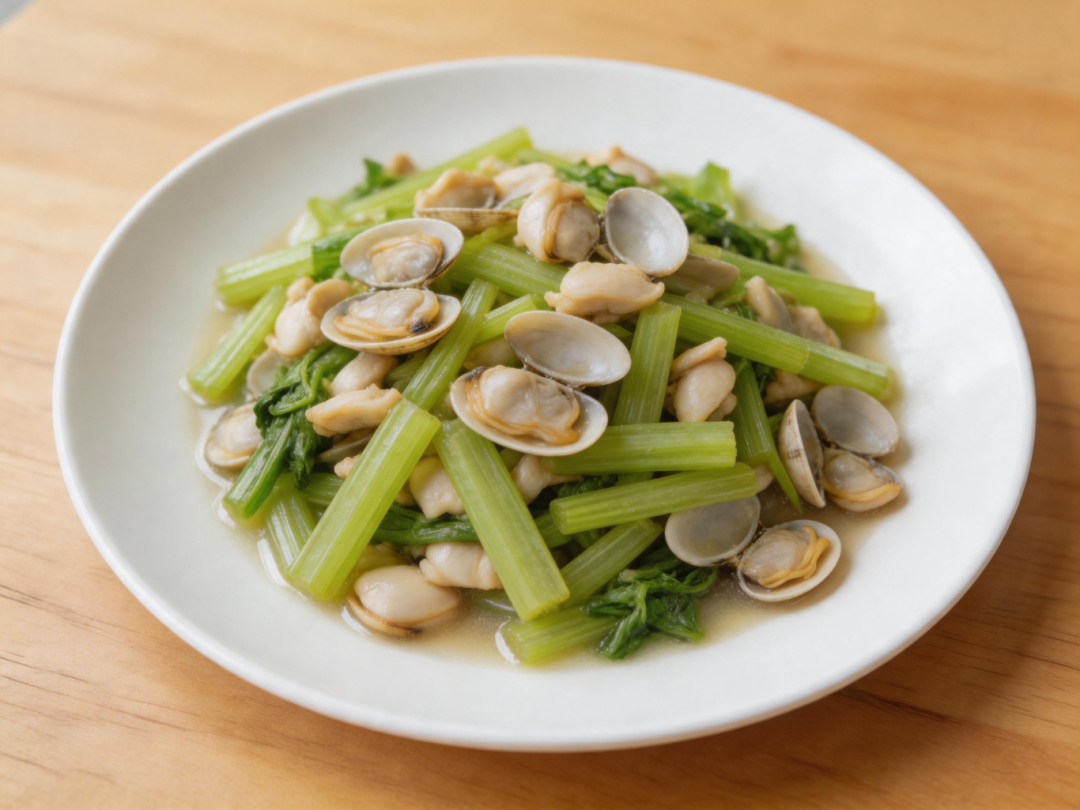 材料:蛤蜊肉200克、芹菜100克,油、盐、味精、姜适量。