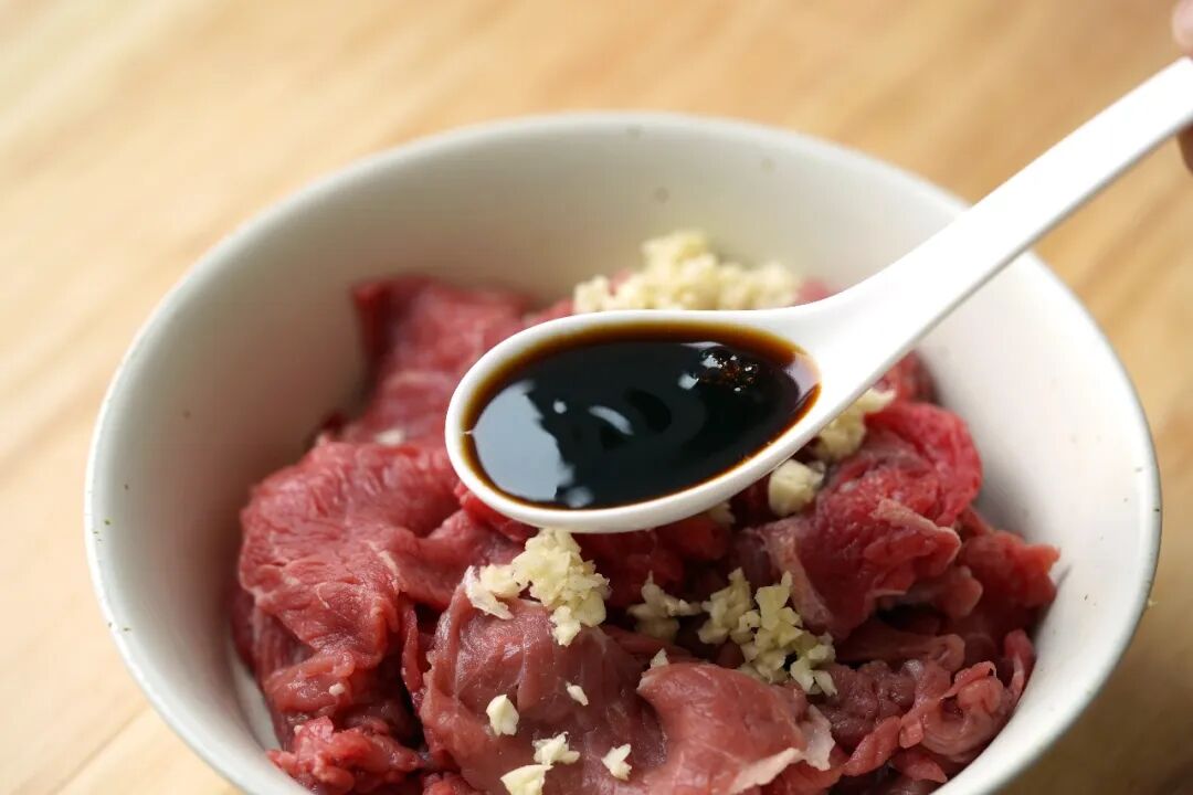 1、300g牛肉片(可以用牛里脊,也可以吊龙片等),加入1勺蒜末,1/6勺白胡椒粉,1/6勺黑胡椒粉,1勺蚝油,1勺生抽,1/2勺淀粉,1勺食用油,抓匀腌制15分钟。