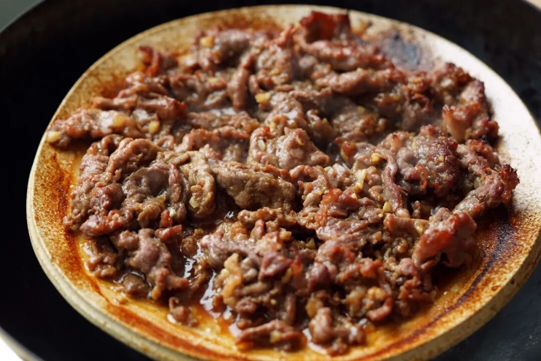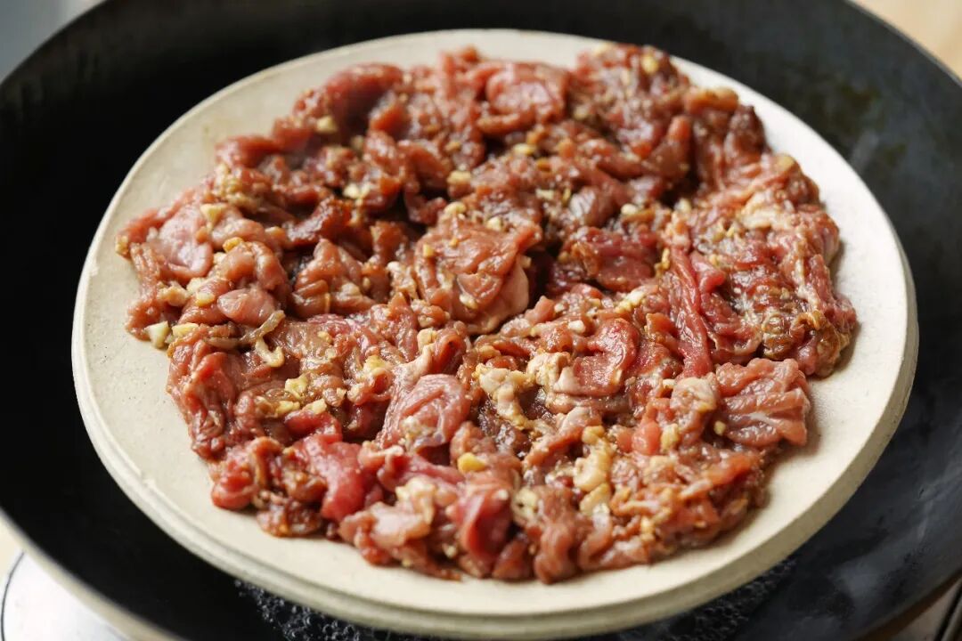 得先把盘子蒸热,热盘接住牛肉,才能不容易出水、更嫩更入味,盘底也不会水汪汪。