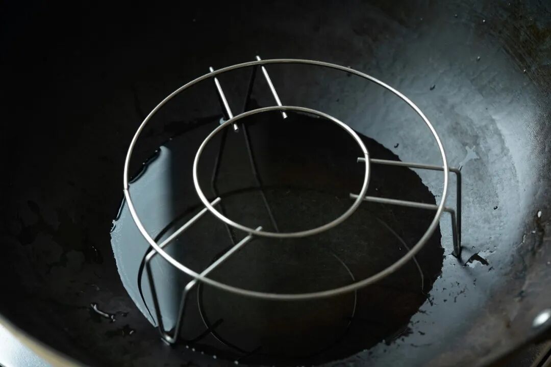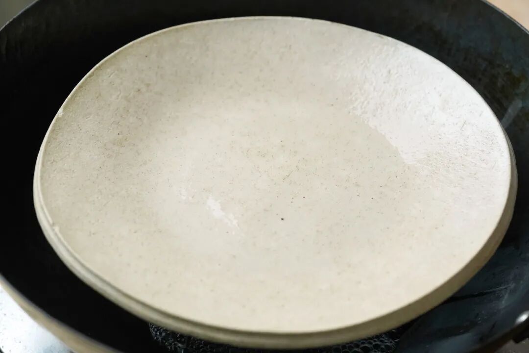 2、取一口炒菜的铁锅,放上蒸架,加入半碗清水(约150ml),放上盘子,大火盖盖,至水煮沸。(这一步是为了让盘子预热)