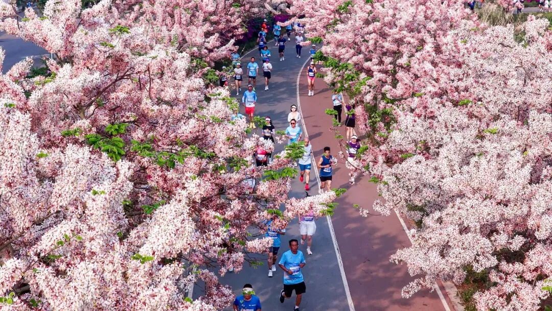 云南石屏异龙湖马拉松跑进花海 徐俊 摄