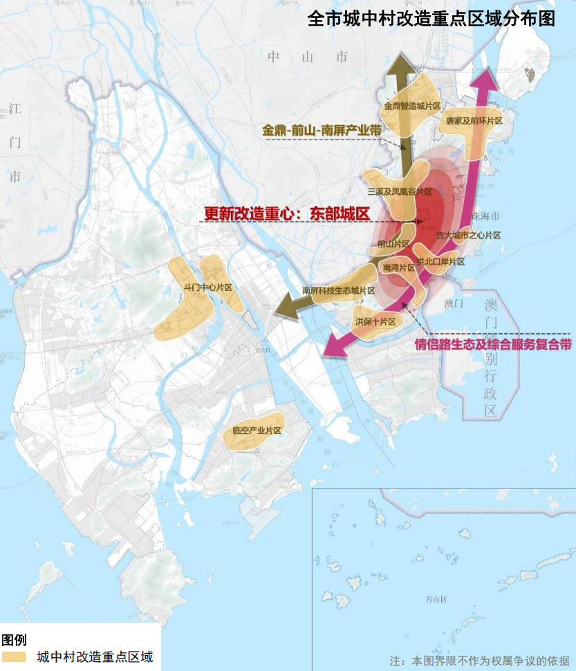 重点推进金鼎智造城、三溪及凤凰谷、南屏科技生态城、洪保十、唐家及前环、斗门中心、临空产业片区等重点片区范围内城中村改造。