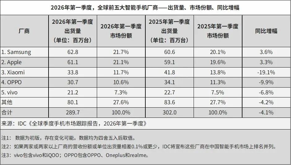 行业寒冬有多么让人揪心?根据IDC的数据,今年1月到3月全球出货量为2.897亿部,和2025年同期相比下降了4.1%。