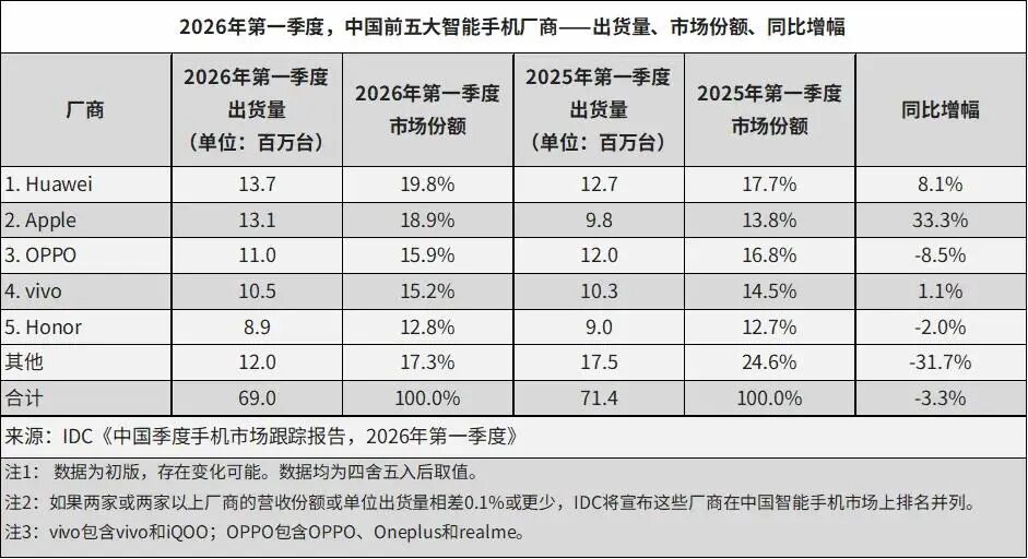 IDC数据给出的数据更加现实,今年第一季度国内手机厂商出货量只有6900万部,和2025年同期的7140万部相比,下降了3.3%。