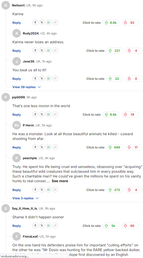 关于此次悲剧,美国网友同情的声音并不多,更多的是一种复杂甚至冷漠的情绪,有人说这是“报应”,也有人把矛头指向他多年来的狩猎行为。