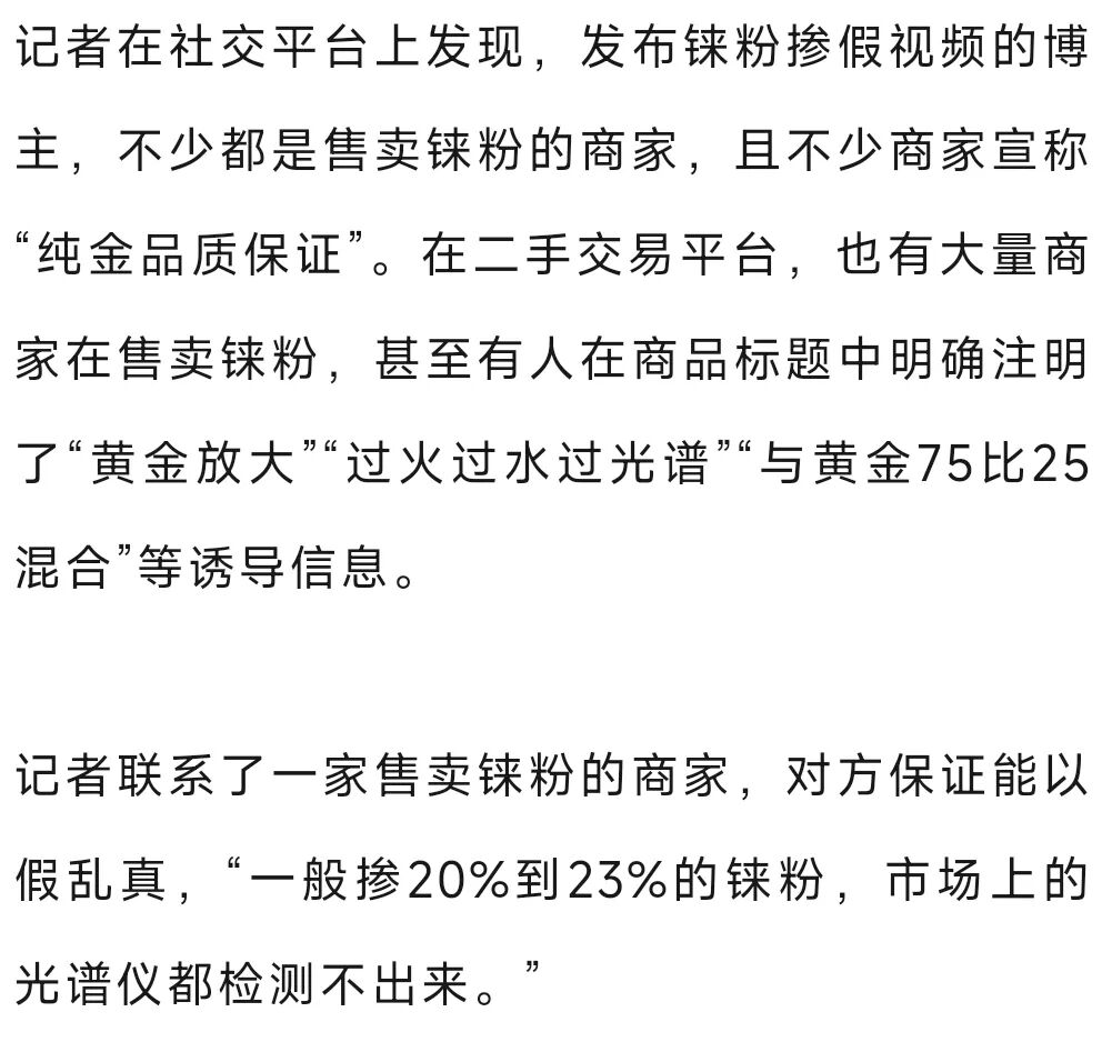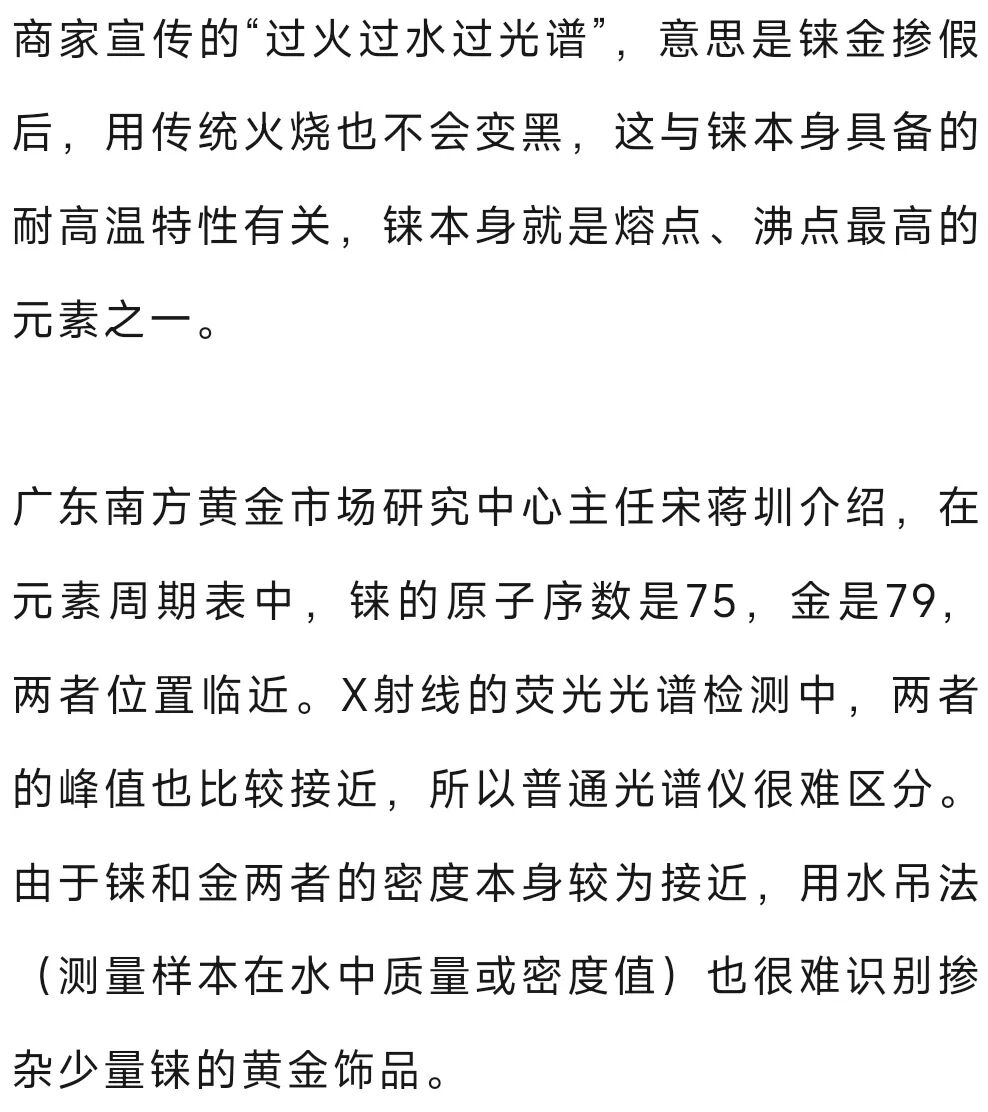 近期,有短视频发布者称,把一种叫作“铼”(lái)的金属粉末掺进黄金里进行高温烧熔,冷却后不仅黄金重量增加,而且无论是肉眼还是机器都发现不了端倪,掺铼的黄金纯度高达99.9%,这是真的吗?有消费者和黄金回收商家反馈买到了掺铼的“假黄金”,如何分辨黄金是否掺铼?