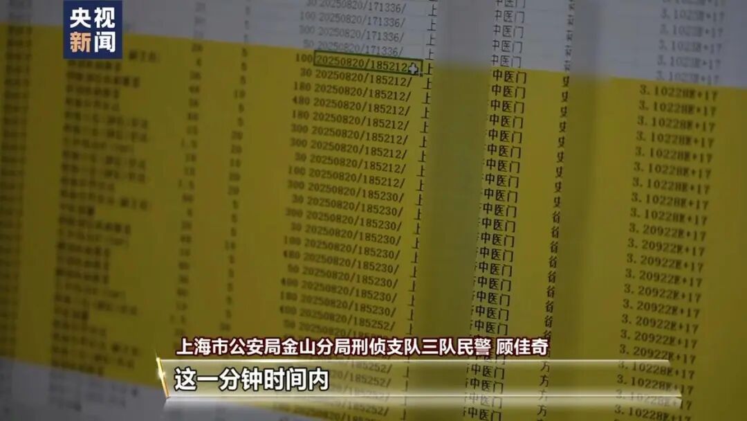 上海市公安局金山分局刑侦支队三队民警 顾佳奇:医生杨某在2025年8月20日18时52分这一分钟时间内,对患者史某开具大量的医疗项目,有中医拔罐、针具针法、颈部推拿、四肢疾病推拿、背部疾病推拿、红外线治疗等项目。在刷完史某的医保卡之后,他紧接着在18时52分30秒,对徐某的医保卡进行空刷套刷。他所开具的项目跟上面史某的项目也如出一辙。在18时52分52秒,他又使用方某的医保卡,对刚才类似的项目进行空刷套刷。