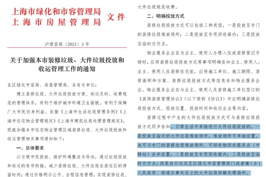 事实上,上海对于大件垃圾的处置并非没有相关规定。早在2021年,相关部门就发布《关于加强本市装修垃圾、大件垃圾投放和收运管理工作的通知》,将大件垃圾区分为装修产生和日常生活产生两类,并明确后者有四类合规投放渠道:小区内指定堆放场所、专用回收箱、临时交付点,以及由居民自行运送至区绿化市容部门或街镇设立的拆解处理场所。