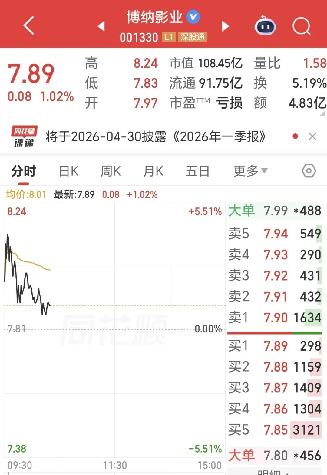 4月27日上午,博纳影业股价持续下挫。截至界面新闻发稿前,其股价为7.89元/股,涨幅从开盘时的5.51%降至1.02%,市值为108.45亿元。
