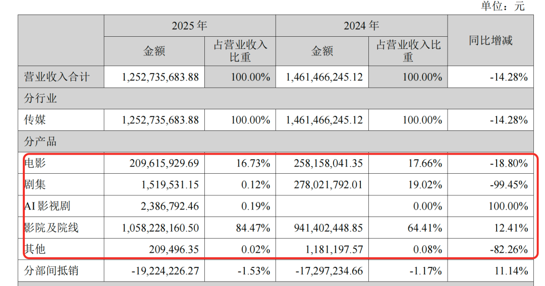 该公司2025年年度报告显示,报告期内,其剧集业务的收入下滑最大,同比下降近100%;电影业务收入同比下降近19%。收入增幅最大的是AI影视剧业务,同比增幅为100%,但是在总体收入中的占比较小;收入占比最大的影院业务同比增幅为12.41%。