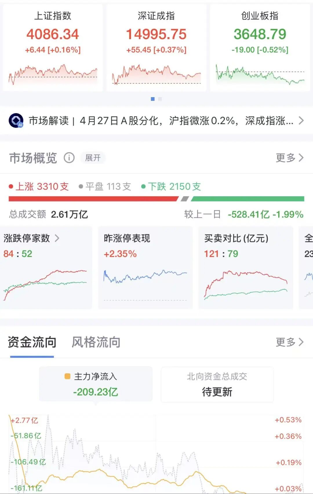 4月27日,四大股指今日收盘涨跌不一,创业板指走势较弱,科创50指数高开高走涨超3.5%。创业板指黄白线分化明显,中小盘股走势较强。上证指数报收4086.34点,涨0.16%,深成指报收14995.75点,涨0.37%,创业板指报收3648.79点,跌0.52%,科创综指报收1901.63点,涨2.5%。A股全市成交额2.61万亿元,较上一个交易日缩量528.41亿元。全市场3310只个股上涨,2150只个股下跌。盘面上,市场热点快速轮动,从板块来看,芯片产业链爆发,华兴源创、格林达、万通发展、朗迪集团均涨停,芯源微触及20CM涨停,长川科技涨超10%,创历史新高。4月27日午后,中芯国际维持强势,截至收盘,中芯国际A股涨幅达5.06%,报116.58元/股,成交额112亿元,最新总市值达5971亿元。CPO概念震荡拉升,立讯精密触及涨停,创历史新高,铭普光磁涨停。锂电产业链表现活跃,西藏珠峰、维科技术双双2连板。绿电板块人气股华电能源(600726)拉升触及涨停,上演“地天板”,成交超27亿元,该股此前走出2连板,今早一度触及跌停。玻璃基板概念再度走强,沃格光电(603773)涨停,走出13天7板。消息面上,日前台积电在公司2026Q1业绩说明会上表示,公司正在搭建CoPoS先进封装技术的试点产线,预估几年后可进入量产阶段。此前三星电机已正式向苹果提供了用于半导体封装的玻璃基板样品。另外,众合科技涨停走出3连板。4月26日,众合科技公告称,公司低轨卫星业务尚处于培育期,相关业务实施主体包括上市公司及公司持股比例62.78%的控股子公司辰极数智卫星技术(浙江)有限公司,目前上市公司自身低轨卫星业务尚处于研发期,未产生收入。下跌方面,算力租赁概念表现较弱,杭钢股份、浙数文化跌停,网宿科技、并行科技、宏景科技纷纷下挫。4月27日,濮耐股份(002225)开盘一字跌停,股价报4.82元,封单超35万手。