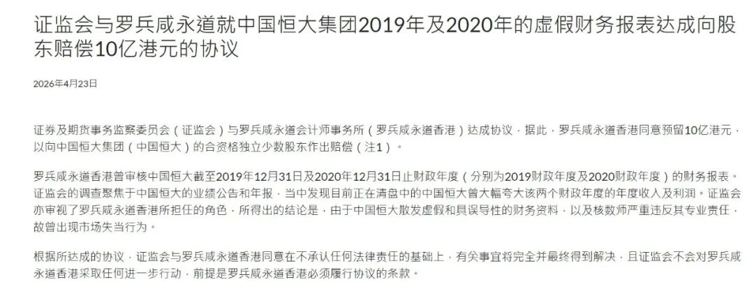 日,香港证券及期货事务监察委员会对外披露,已与普华永道香港达成协议。普华永道香港将预留10亿港元资金用于向中国恒大的合资格独立少数股东作出赔偿。
