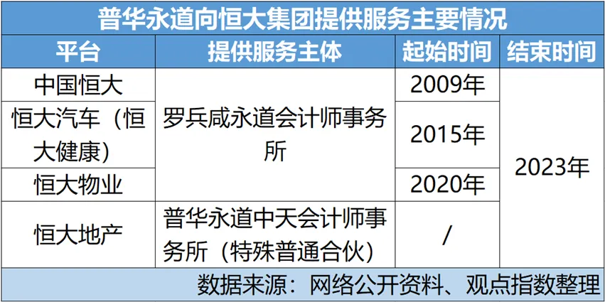 普华永道与恒大的合作开始于2009年。当时,恒大赴港上市时,普华永道香港就担任着申报会计师,此后双方保持合作直到2023年初,一共14年,期间还同时担任恒大物业、恒大汽车等附属公司的核数师,并就相关综合财务报表持续出具无保留审计意见。