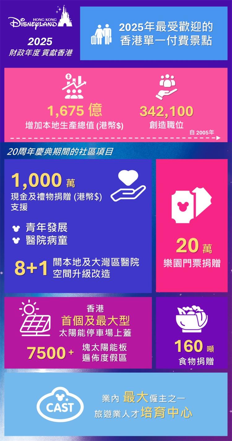 香港旅游及经济的重要支柱:回顾过去20年的营运,香港迪士尼为香港带来合共1675亿港元的GDP增加值,并为前线员工及旅游业创造了合共342100个就业机会,为本港整体经济作出重大贡献。香港迪士尼持续成为2025年最受欢迎的香港单一付费景点。
