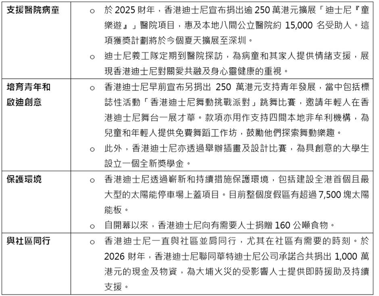 为“奇妙缔造者”创造就业机会:于2025财年,香港迪士尼雇用约9000名全职及兼职员工,持续成为香港旅游及家庭娱乐产业中最大雇主之一。