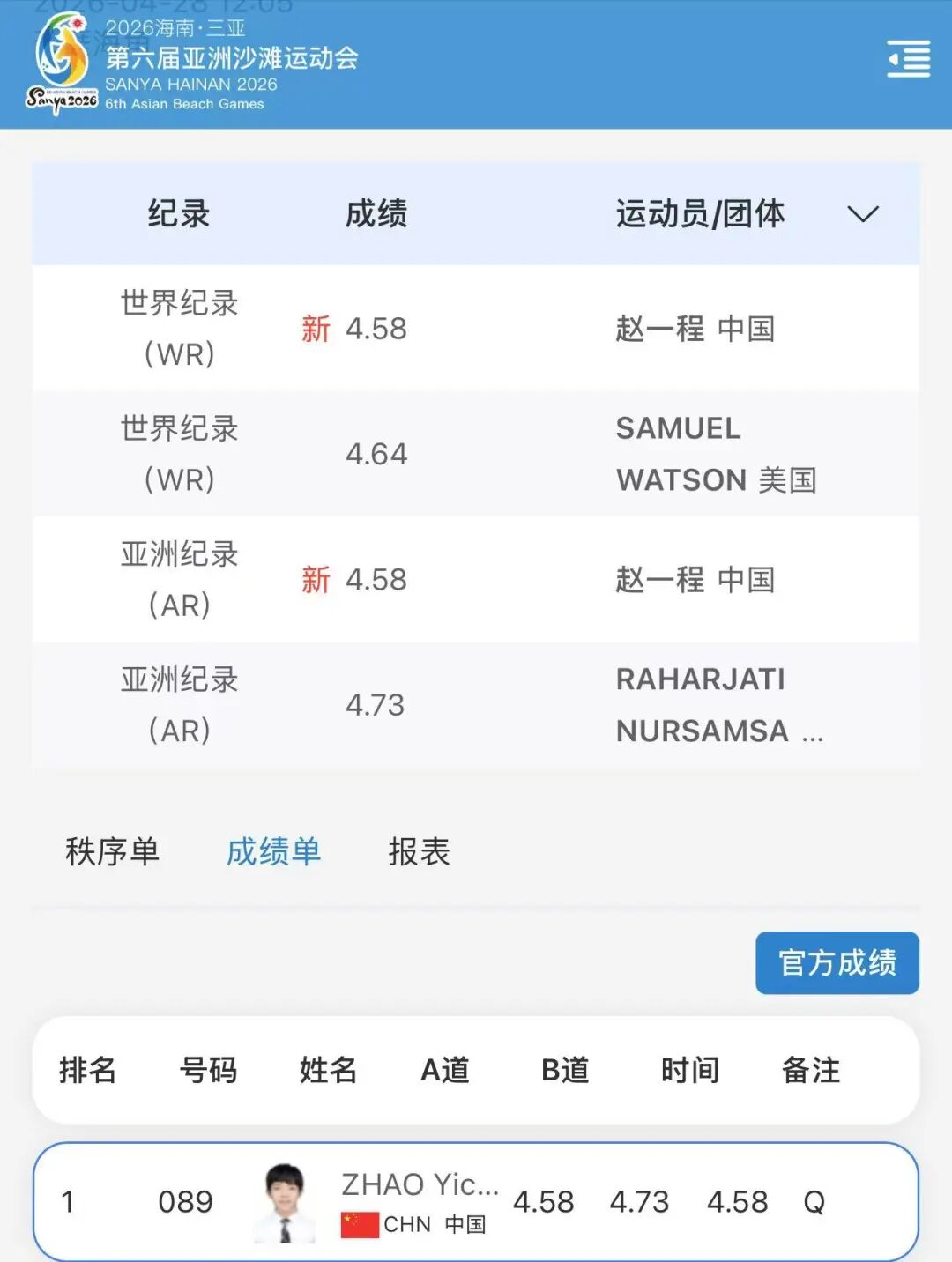 2025年3月的国家攀岩集训队选拔赛中,赵一程连续爬出4秒68和4秒65,两次超当时的世界纪录(4秒74)。