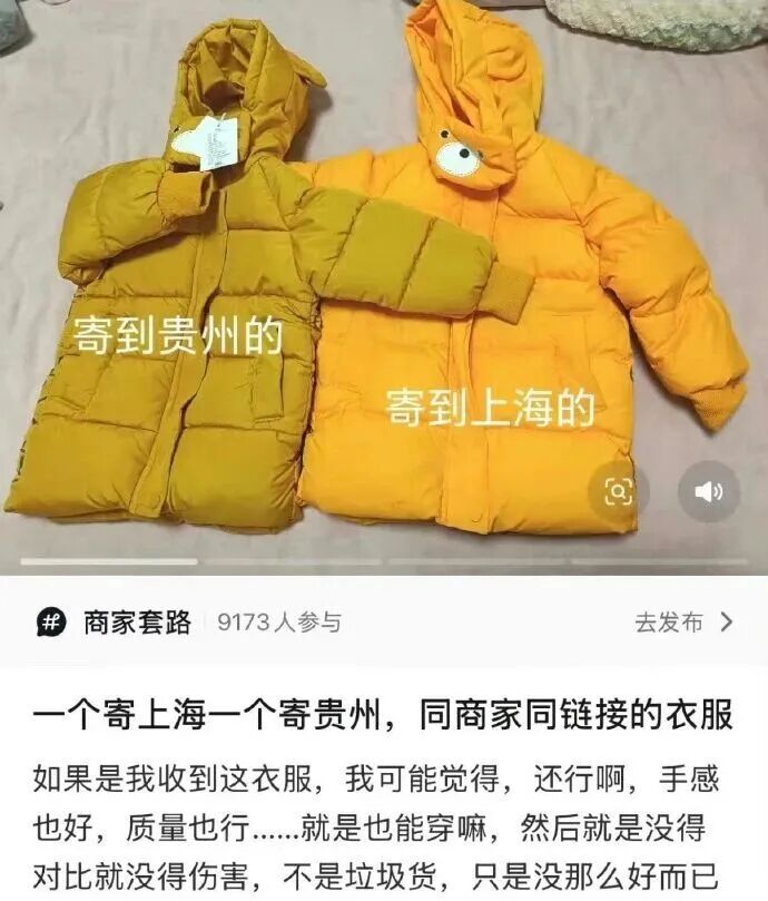有博主实测在同家店铺买同款商品,收货地址分别是深圳,山东,四五线小县城。