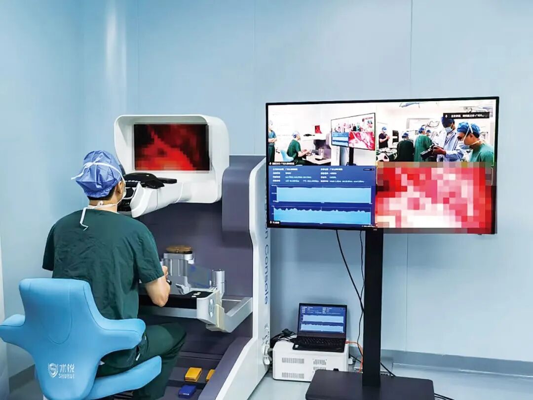 ▲国内首例小儿外科国产单孔机器人远程手术现场