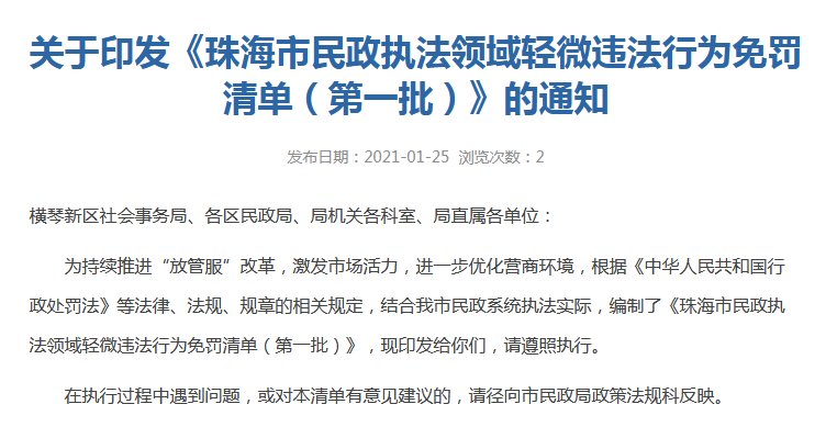 注意啦! 珠海市民政执法领域 轻微违法行为免罚清单(第一批) 发布! 为持续推进“放管服”改革,激发市场活力,进一步优化营商环境,近日,珠海市民政局发布“关于印发《珠海市民政执法领域轻微违法行为免罚清单(第一批)》的通知”。根据通知, 下列违法行为 同时具备相应轻微情节, 主动消除影响, 没有造成危害后果的, 可以不予行政处罚。 (一)社会团体不按照《社会团体登记管理条例》第二十八条规定接受监督检查。 处罚依据:《社会团体登记管理条例》第三十条第一款第(三)项 轻微情节:首次违法,主动消除影响,已启动注销清算工作(已报纸公告),未造成危害后果。 (二)民办非企业单位不按照《民办非企业单位登记管理暂行条例》第二十三条规定接受监督检查。 处罚依据:《民办非企业单位登记管理暂行条例》第三十五条第一款第(三)项 轻微情节:首次违法,主动消除影响,已启动注销清算工作(已报纸公告),未造成危害后果。 (三)基金会不按照《基金会管理条例》第三十六条第一款规定接受监督检查。 处罚依据:《基金会管理条例》第四十二条第一款第(五)项 轻微情节:首次违法,主动消除影响,已启动注销清算工作(已报纸公告),未造成危害后果。 (四)行业协会不按照《广东省行业协会条例》第三十二条规定接受监督检查。 处罚依据:《广东省行业协会条例》第三十五条第一款第(三)项 轻微情节:首次违法,主动消除影响,已启动注销清算工作(已报纸公告),未造成危害后果。 来源珠海市民政局,如有侵权请联系删除。 |