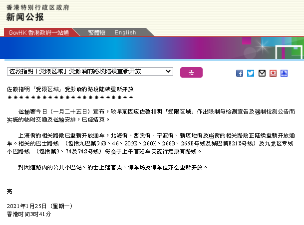 疫情暴发以来,香港特区政府首次宣布“封区抗疫”,目标是在48小时内完成约1万人的核酸检测。今日(25日),特区政府完成在佐敦“受限区域”的限制与强制检测行动,“受限区域”在凌晨3时30分左右解封。 佐敦“受限区域”解封 发现13例确诊病例 特区政府23日引用《预防及控制疾病(对若干人士强制检测)规例》,限制在佐敦指明“受限区域”内的人士须留在其处所并按特区政府安排接受强制检测。受检人士分批到采样站接受鼻腔及咽喉合并拭子采样,在取得检测结果前,他们必须留在处所内,以减少交叉感染风险。 △香港特区政府新闻公报截图 今日凌晨,特区政府发布新闻公报指,在宣告生效期间,大约有7000名居民接受新冠病毒检测,目前已发现13例新冠肺炎确诊病例,确诊率为0.17%。所有确诊病例及其密切接触者已被隔离或送往医院进行治疗。 特区政府调动超过3000人参与这次行动的相关工作,其中有1600名纪律部队人员,同时还安排了50多名能讲尼泊尔语、乌尔都语和印地语的人员,以协助少数族裔人士。此外,特区政府为接受检测的人员提供了多种食物,包括发放6500个食物包,内含即食面、意大利粉、罐头食品等。 特区政府表示,由于居民、相关部门及检测承办商的同心协力,此次行动才能提早结束,让市民能在早上开始恢复正常生活,有充分时间准备上班工作,感谢受检人员的支持和体谅,希望短暂的不便能够彻底截断区域内的病毒传播链。 受影响路段陆续开放 加强“受限区域”清洁消毒 △香港特区政府新闻公报截图 特区政府运输署于今日凌晨宣布,因应“受限区域”作出的临时交通及运输安排已经结束。上海街的相关路段已重新开放通车,北海街、西贡街、宁波街、新填地街及庙街的相关路段正陆续重新开放通车。相关的巴士路线将会于上午首班车恢复行走原有路线。 此前,特区政府食物环境卫生署表示,会加强“受限区域”街道的清洁工作,也会安排在油麻地街市、新填地街熟食小贩市场和新填地街及庙街小贩排档区进行深层清洁消毒,以保障市民及商贩的健康与安全。 来源央视新闻,如有侵权请联系删除。 |