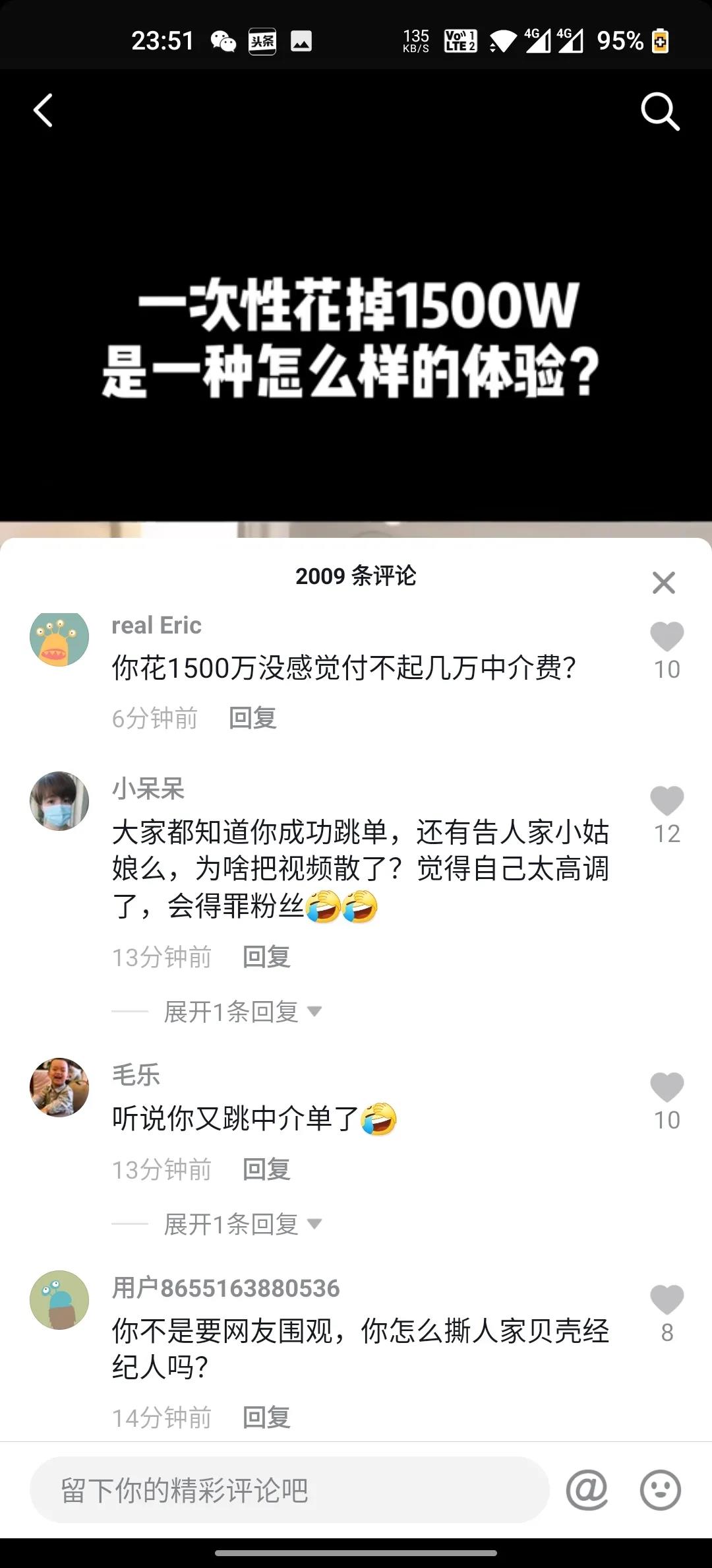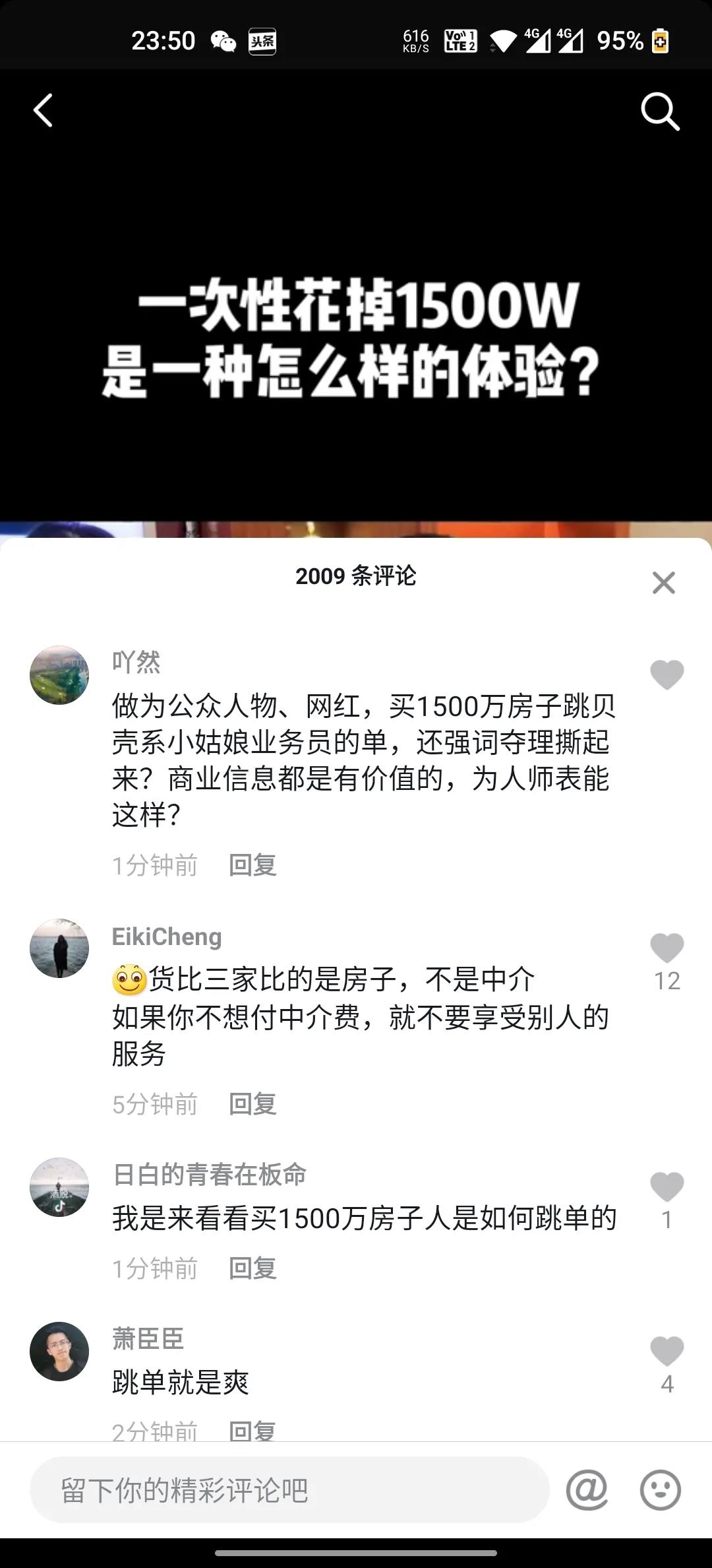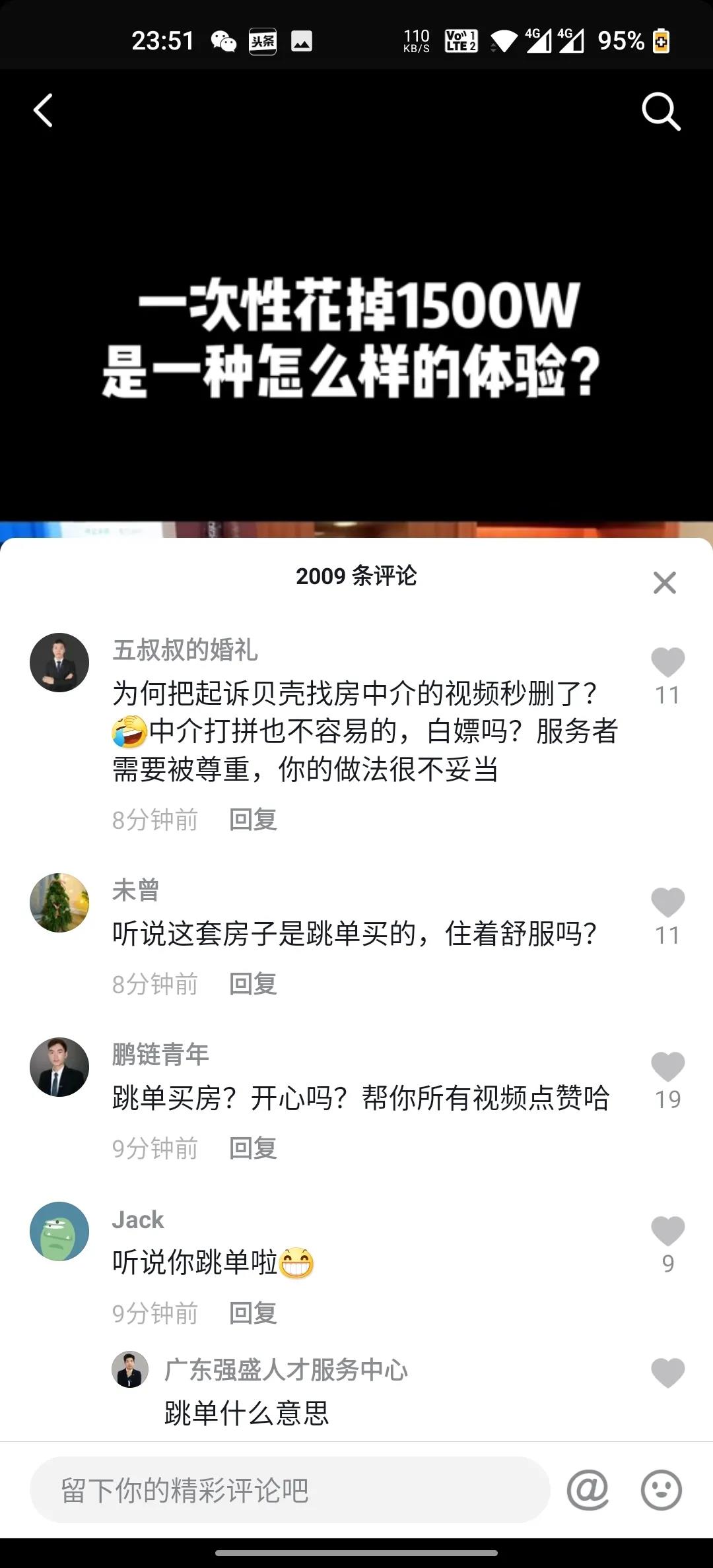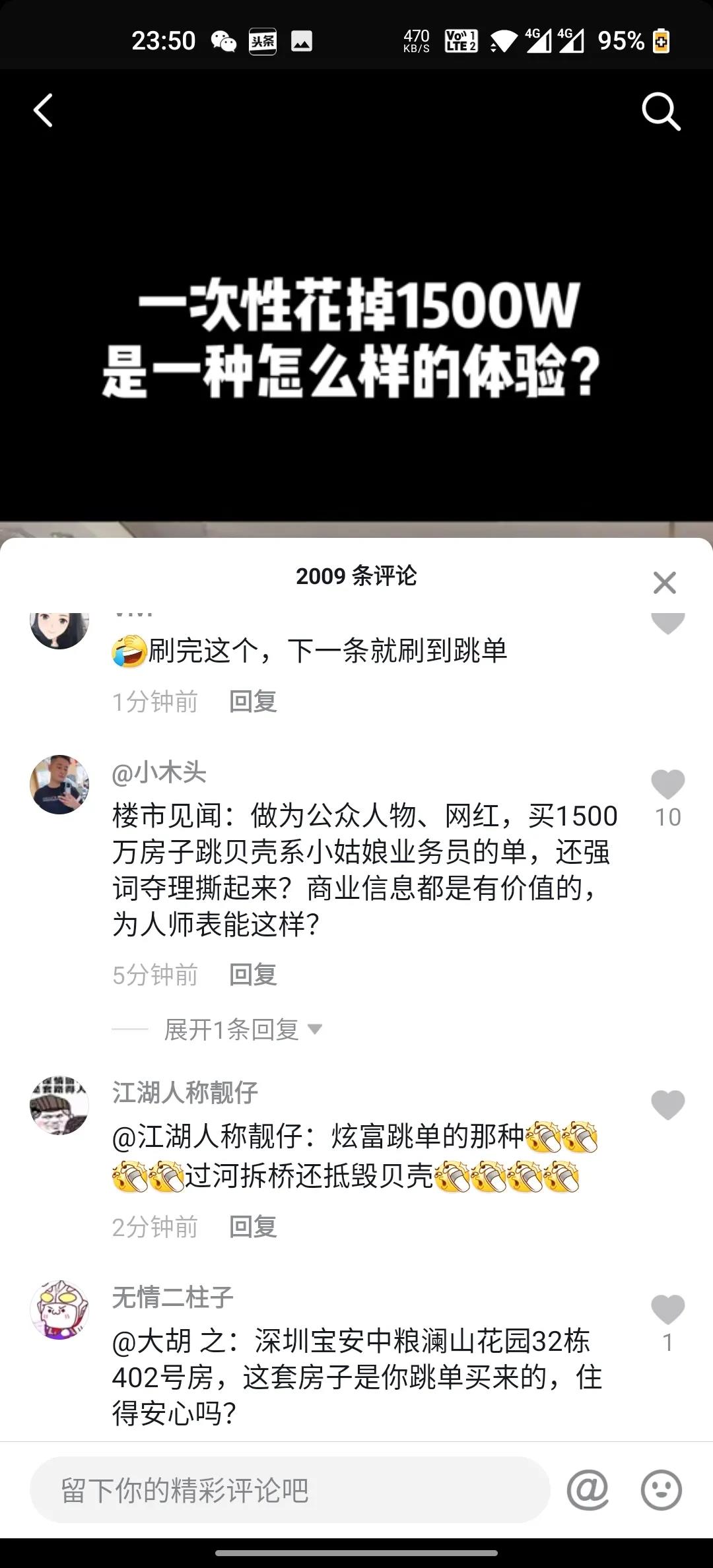 | 近日,深圳某网红(抖音600多万粉丝)购买宝安中粮澜山总价1500万房子,跳开贝壳平台全程服务的中介小菇凉,私下与业主达成交易,并且反手向贝壳公司投诉该中介,让法务要求中介道歉。 此事一出,中介从业人员集体刷爆该网红短视频留言栏,同时在朋友圈火速传开。 因为这件事突然被闹大,该网红目前将某音账号设置成了私密账号,她炫富的视频也看不到了。
