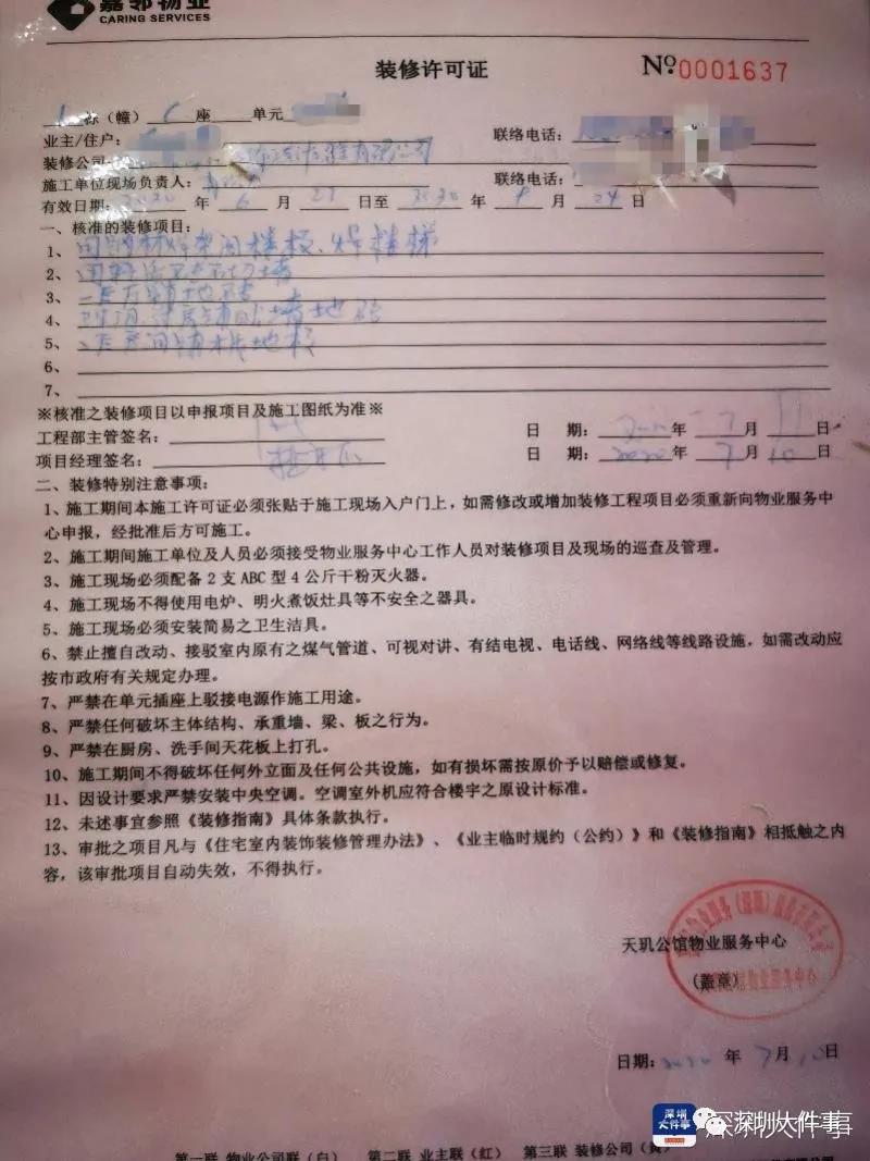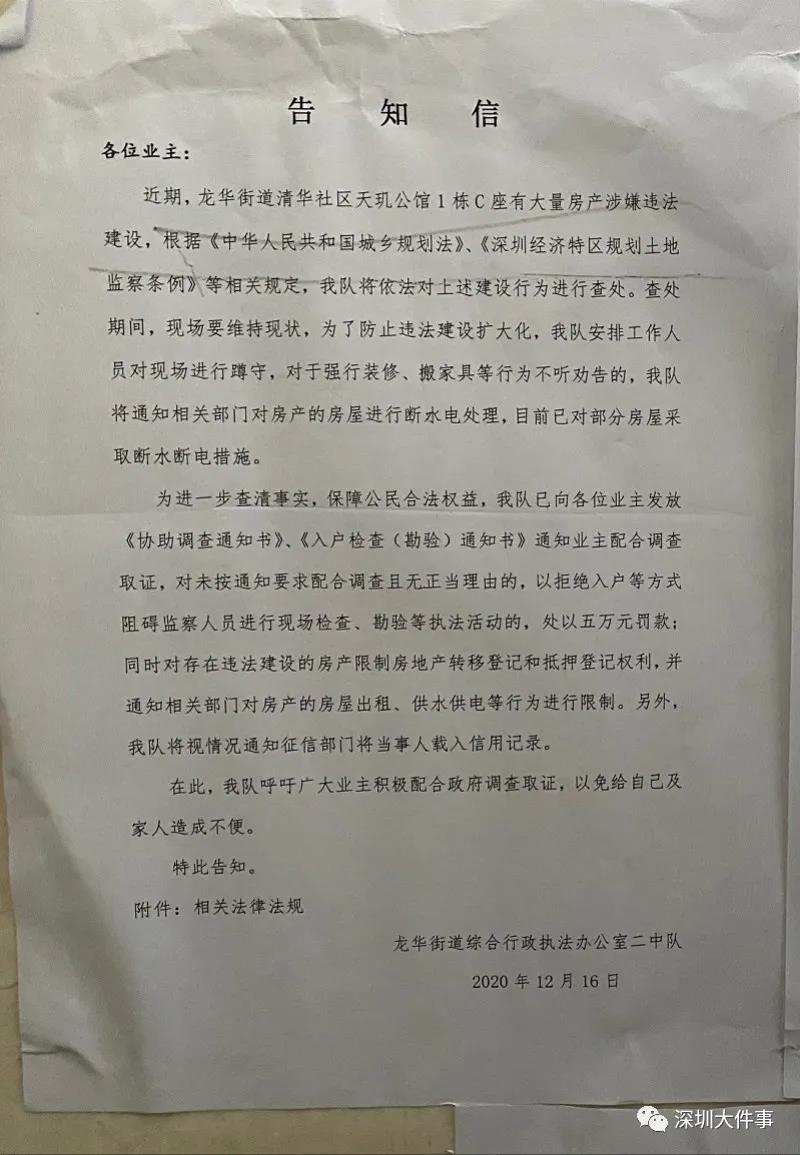 设想一下 如果你买了房子 然后按照样板房设计进行装修改造 结果突然被认为是“违建”? 这是不是让人很难接受? 最近 深圳一小区多位业主 就称自己遇到了这样的事情 近日,深圳龙华区天玑公馆多位C栋业主向南都记者报料称,自己在房屋内建设二层阁楼和厨卫空间的改造被相关部门认定为违建。业主们称,自己改造与看房时的样板房样式一致,且取得物业的装修许可。 对此,相关部门回应称,此前巡查未发现设置样板房,约谈开发商时其也称不存在样板房。 那么 这到底是怎么回事呢? 业主改造房屋被认定违建 称按购房时样板房装修 近日,龙华区天玑公馆小区C栋多位业主向南都记者反馈称,他们在房内进行的装修改造被认定为违建,相关执法部门已经阻止他们继续装修入住。 南都记者在现场看到,C栋电梯间张贴了一份落款为龙华街道综合行政执法办公室二中队(以下简称执法队)的《告知信》,其中提到: “天玑公馆1栋C座有大量房产涉嫌违法建设……我队将依法对上述建设行为进行查处” “对于强行装修、搬家具等行为不听劝告的,我队将通知相关部门对房产的房屋出租、供水供电等行为进行限制。另外,将视情况通知征信部门将当事人载入信用记录”。 业主张先生(化名)表示,他们是因在屋内架板隔出二层、建设厨房和卫生间而被认定为违建,但这些都是按照看房时位于C栋313的样板房样式进行的装修,而如今样板房已经被拆除。 包括张先生在内的多位业主向记者提供了几段据称是样板房的视频,记者看到视频拍摄者站在铺设了木质地板的二层阁楼上,有一楼梯通往一层,二层内有一区域安放有马桶、洗手池等洁具,其他区域则放有床、沙发、书桌等家具。 据张先生介绍,因为看样板房时被楼盘销售人员告知不能拍摄视频,所以业主仅偷拍到部分画面,样板房的厨房和另一个卫生间则位于一层。他告诉记者,自己是于2019年4月前往天玑公馆售楼中心看房。 据此前媒体报道,执法队曾于1月给小区A、B栋投诉C栋违建的业主回复称:“经核查,C栋用途为办公性质,装修过程中私自违规搭建阁楼,增设独立厕所、厨房、把办公改建成复式公寓。” 合同称房屋用于“办公” 但有厨卫保修条款 张先生称,他在看房时销售中心工作人员称C栋属于“公寓”,另有其他多名业主称销售人员对他们的说法是C栋为“商住两用公寓”。 据张先生提供的一份共42页、已装订成册的购房合同显示,他所购房产用途为“办公”。但记者注意到,合同第15条“保修”中提及,房屋“厨房和卫生间地面”保修期限“为2年”。 张先生提供的购房合同显示房屋性质为“办公”。 C栋一位业主提供的装修许可证中提及的核准装修项目包括焊架阁楼板、焊楼梯。 张先生表示,在他签署合同时合同并未按顺序装订成册、而是在一张张文件上签字,“他翻一页我们就签一页”。针对记者提出的是否查看了文件内容,张先生称“营销人员会催你,说这个都是一样的,没什么看的,我们又不会改变的。”其妻子在看了前几页内容后便相继签字。其他多位业主也称是以该方式签署合同。 合同中还提及了样板房的相关条款,其中第28条规定“出卖人所作出的销售广告、宣传资料符合要约条件的以及样板房等说明和允诺具体确定,并对商品房买卖合同的订立以及房屋价格的确定有重大影响的,视为本合同的组成部分,出卖人应承担相应的义务”。 不过在合同第31页的附件条款“十七、对买卖合同第二十八条的修改及补充”中,对此前提及的样板房相关条款进行了否认:“出卖人在项目现场展示的样板间、临时搭建的构筑物、装饰物、摆放物、销售模型、道路等均不构成要约或者合同内容,双方不受其约束。样板房并非出卖人承诺的交楼标准或未来可实现状态。” 此外,张先生还表示,装修前他们向物业提供了施工图纸等报备并得到了许可,多位C栋业主提供的施工图纸均是按两层、包含厨卫空间的样式设计。据一位C栋业主提供的日期为2020年7月、落款为天玑公馆物业服务中心的《装修许可证》显示,核准的装修项目包括“用钢材焊架阁楼板、焊楼梯”、“卫生间、厨(疑似)房铺贴墙地砖”、“二层房间铺木质地板”。 此外还有C栋业主向记者提供了一份《装修竣工验收申请》,其中物业服务中心及其工程部、安全部、客服部意见中,均出现涂改痕迹,验收合格处的“√”被抹除,不合格处被打勾,工程部要求整改项目中提到“夹层加建”。 多位C栋业主提供了据称为样板房的视频 记者现场走访: 房屋高度超过4米 毛坯房窗户有两层 在天玑公馆C栋内,记者看到通道出入口、楼梯等位置均有执法队工作人员在现场蹲守,防止C栋业主继续进行装修工作。 在一户尚未进行装修的C栋毛坯房内记者看到,这间房屋的高度超过4米,一面墙上安装有上下两层窗户且均装有护栏,在一侧墙柱的中部留有白色划线;在一侧墙面的上半部分还安装有水龙头,显然无法从地面上直接使用。张先生称,白色划线是用于架设阁楼板定位使用。 记者在现场看到的C栋未装修的毛坯房。 投诉业主认为 C栋业主改造已改变房屋性质; 目前开发商暂未予以回应 对于C栋业主进行的改造 向相关部门进行投诉的部分A、B栋业主 则有自己的看法 记者在现场走访时,一位天玑公馆B栋业主直言:“网上房地产信息都有的,买房之前肯定要了解房子是干