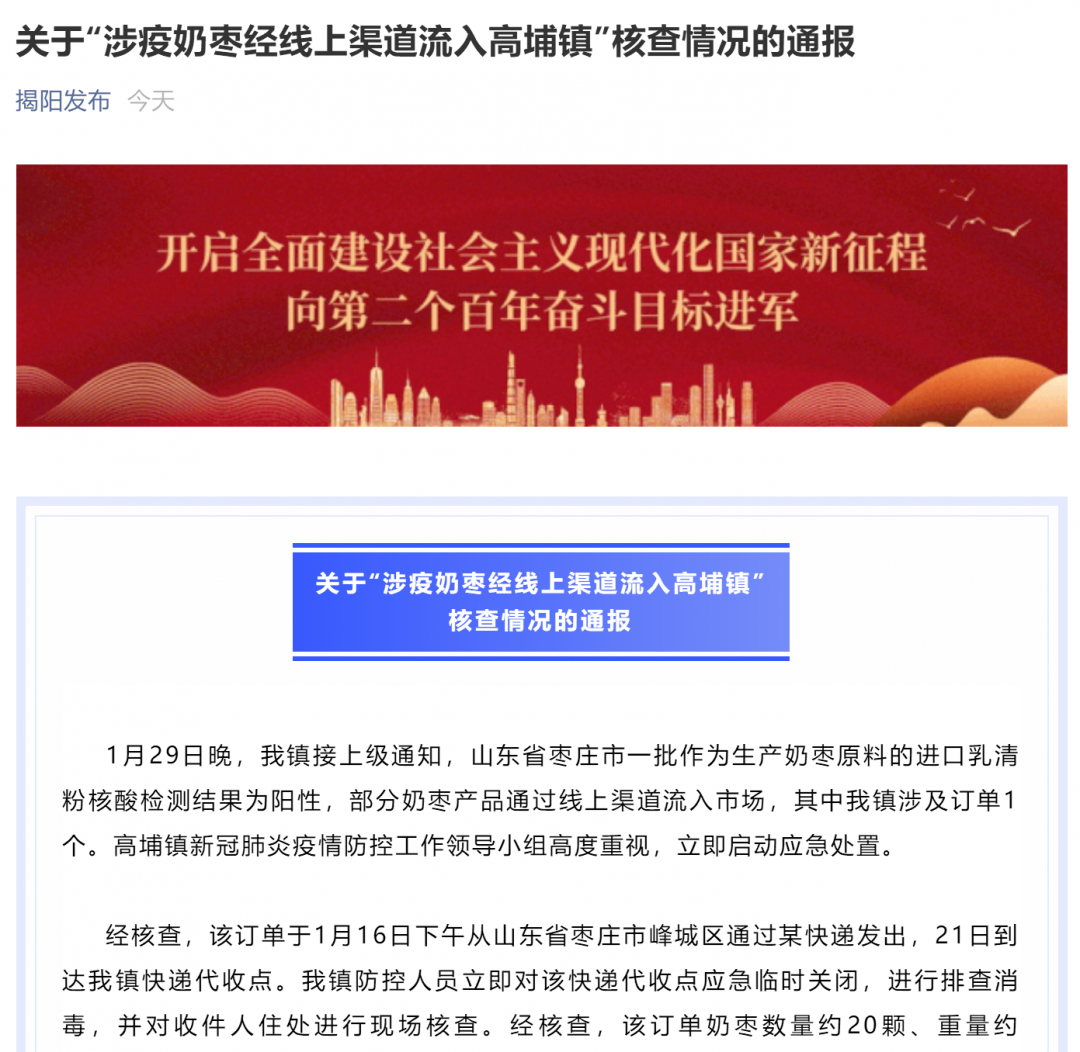 近日,山东一批涉疫奶枣引起社会广泛关注,记者了解到,目前广东汕尾市、佛山市、揭阳市已通报发现有涉疫奶枣流入现象,且均是通过线上渠道流入,有市民收到订单后,已与家人分食完。据相关部门通报,目前佛山、揭阳涉疫奶枣接触人员核酸检测结果均为阴性。 2月1日,“南海发布”微信公众号发布一则《情况通报》,内容如下: 关于山东省涉疫奶枣查处情况通报 2021年1月29日晚,我区接到山东省枣庄市通报,要求紧急处置通过线上销售流入我区的山东涉疫奶枣产品。接报后,区卫健局、区公安分局、区疾控中心、市场监督管理局、各镇(街道)指挥部联合开展事件处置。至1月31日上午,已全部完成涉事产品追踪和采样检测,其中3份样品新冠病毒核酸检测结果为阳性(里水镇2份,九江镇1份),其余均为阴性。我区所涉的63名接触人员已全部按规定落实健康管控措施和核酸检测,核酸检测结果均为阴性;市外所涉的34名接触人员均已函告当地开展健康管理,暂无收到阳性反馈。目前涉疫产品已全部回收,并按规程进行消毒处置。涉事人员的居住和工作环境均按规定进行终末消毒工作。 下一阶段我区相关部门将持续落实疫情防控的各项工作,请市民及时关注官方信息发布,不造谣、不信谣、不传谣、不恐慌。 关于“涉疫奶枣经线上渠道流入高埔镇” 核查情况的通报 1月29日晚,我镇接上级通知,山东省枣庄市一批作为生产奶枣原料的进口乳清粉核酸检测结果为阳性,部分奶枣产品通过线上渠道流入市场,其中我镇涉及订单1个。高埔镇新冠肺炎疫情防控工作领导小组高度重视,立即启动应急处置。 经核查,该订单于1月16日下午从山东省枣庄市峰城区通过某快递发出,21日到达我镇快递代收点。我镇防控人员立即对该快递代收点应急临时关闭,进行排查消毒,并对收件人住处进行现场核查。经核查,该订单奶枣数量约20颗、重量约0.5kg。收件人21日收到该订单后,于当日与其家人分食完。镇防控人员对收件人一家4人和快递代收点工作人员4人采集核酸并送往市权威机构检测,核酸检测结果均为阴性。 目前是常态化下新冠肺炎疫情防控的关键阶段,镇新冠肺炎疫情防控办在此呼吁广大群众,请务必增强自我防护意识,保持勤洗手、戴口罩、常通风、少聚集等良好习惯。及时关注官方信息发布,不信谣、不传谣、不造谣、不恐慌。 高埔镇新冠肺炎疫情防控办 2021年1月30日 1月31日, 据汕尾市市场监督管理局消息, 山东一批涉疫奶枣 通过线上渠道流入广东汕尾市。 【延伸阅读】 涉疫奶枣传染给人的风险大吗?专家解答 国家食品安全风险评估中心副主任李宁1月31日表示: ① 核酸检测主要针对的是病人的核酸片段,无论是活病毒还是死病毒都有可能检出阳性,因此食品检出核酸阳性,不代表具有传染性,只能说明它曾经被新冠病毒污染过; ② 目前还没有发现消费者经采购、加工食品而感染新冠病毒的案例; ③ 从全国各地对食品及其外包装新冠核酸检测来看,总体的阳性率比较低,不到万分之一,总体污染量也是比较低的。 中国疾控中心副主任冯子健20日表示,一些进口货品在核酸检测中显示阳性,并不意味着一定有传染性,要看它污染的量,另外污染的病毒是不是有活性。 来源央视新闻客户端、信息时报,如有侵权请联系删除。 |