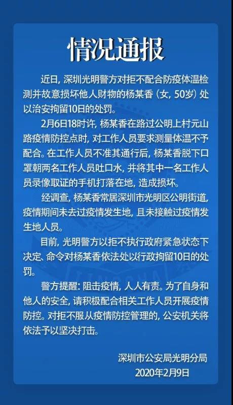 最近,春运已经开始一段时间了 为了做好防疫工作 深圳各大车站均出了相关规定 比如深圳北站虽无需出示核酸证明 但需凭健康码进站乘车 大部分人都积极主动配合防疫 但总有些人“以身涉法” 日前,深圳一男子进入车站时 不仅不出示健康码 还殴打工作人员 ▼ 到底怎么回事呢? 一起来看看 男子拒不出示健康码 强闯深圳北还殴打工作人员 2月3日 一男性旅客在深圳北火车站进站口 拒不出示健康码 强行闯入被拦下后 侮辱工作人员并挥拳殴打1名工作人员 据警方介绍,3日12时50分许,一男性旅客冉某在深圳北站西广场进站口防疫检查处拒不出示健康二维码,强行闯过防疫检查口,在防疫工作人员对其进行阻拦并再三要求其出示健康二维码后,他拒不出示并继续强行闯入。 随后3名防疫工作人员将男子拦下,此过程中冉某情绪激动,侮辱工作人员并挥拳殴打1名工作人员脸部,在试图继续殴打时,被防疫人员合力制止。 在附近巡逻的深圳北站派出所民警发现警情后赶赴现场处置,随后将冉某传唤至派出所作进一步调查。 打人者已被依法行政拘留 据了解,冉某今年40岁,重庆市万州区人,当天是送妻子到深圳北站乘车的。妻子进站后,他发现妻子漏拿了行李箱,当时因为着急给妻子送行李箱,一时情绪激动,才殴打了防疫工作人员。在其情绪平复后,冉某意识到自己行为的错误,诚恳地向工作人员道歉并得到了谅解。 鉴于冉某认错态度良好,深圳铁路公安处根据《中华人民共和国治安管理处罚法》第二十三条第一款第二项之规定,决定对其处以行政拘留五日的处罚。 深铁警方提醒广大旅客—— 为了自己和他人的健康和安全,出行时一定要做好个人防护措施,乘车进站时准备好个人健康二维码,自觉遵守防疫相关措施和要求,主动接受工作人员的防疫检查。 对拒不配合防疫工作检查,扰乱正常防疫秩序等行为,公安机关将依法予以坚决打击和严厉处罚。 疫情防控,需要人人参与 但是却总有个别人拒不配合 拒不测量体温、殴打威胁保安 打人女子被拘留7日 2020年2月8日14时27分,深圳福田区一小区住户卢某某(女,48岁),外出归来后拒绝物业保安为其例行测量体温,欲强行进入小区,保安员告知其测量体温后方可进入小区,卢某某不听劝阻,接着踢打并持违禁品威胁物业保安员。随后该女子被拘留7日。 拒不配合测温还吐口水 深圳一女子被行拘10日 2月6日18时许,杨某香在路过公明上村元山路疫情防控点时,对工作人员要求测量体温不予配合。在工作人员不准其通行后,杨某香脱下口罩朝两名工作人员吐口水,并将其中一名工作人员录像取证的手机打落在地,造成损坏。 经调查,杨某香常居深圳市光明区公明街道,疫情期间未去过疫情发生地,且未接触过疫情发生地人员。目前,光明警方以拒不执行政府紧急状态下决定、命令对杨某香依法处以行政拘留10日的处罚。 关键时期 戴口罩、配合工作人员测量体温十分重要 2020年2月5日,深圳市公安局发布关于依法严厉打击新型冠状病毒感染的肺炎疫情防控期间违法犯罪的通告。 其中提到—— 疫情防控人人有责 最近正处于疫情防控重要时期 请大家做好防护,配合防疫工作 齐心协力,共同“抗疫” |