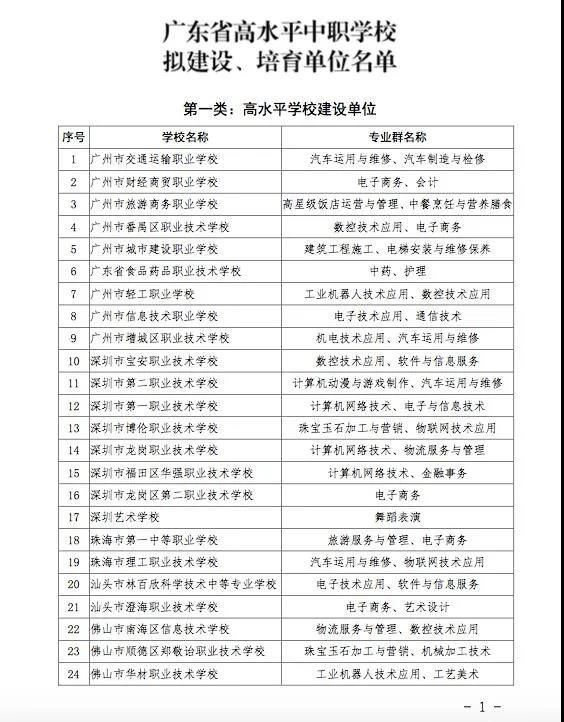 : 2月5日,广东省教育厅发布《关于广东省高水平中职学校拟建设、培育单位名单的公示》,广州市交通运输职业学校、广州市财经商贸职业学校、广州市旅游商务职业学校等88所中职学校入选。 根据《广东省教育厅关于实施广 ...