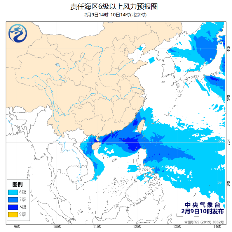 大风预报:2月9日-10日,台湾海峡、广东省中东部海面东北风7级~8级转6级~7级,西部海面偏东风6级~7级;除夕到初二白天(2月11日-13日),台湾海峡、东部海面东北风6级~7级。
