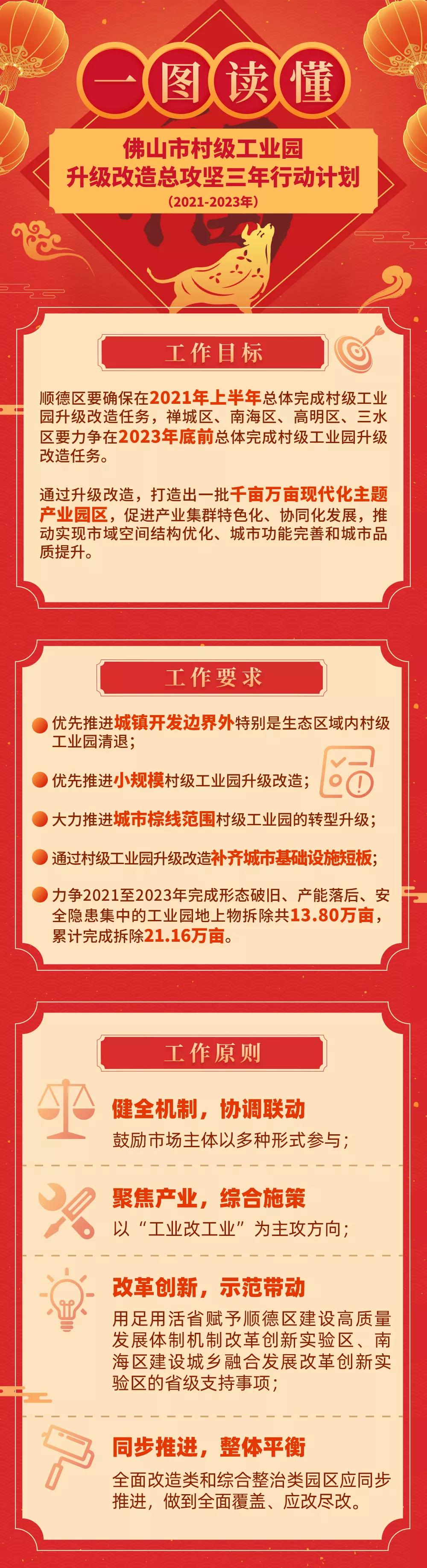 今天(2月19日)上午,6台钩机同时启动,桂城街道夏南片区村级工业园连片改造项目开拆,拆除面积约3万平方米。佛山打响“十四五”开局之年的“第一炮”,吹响了村改总攻坚的嘹亮号角! 同日,2021年佛山市村改总攻坚现场会在南海召开。现场下发了《佛山市村级工业园升级改造总攻坚三年行动计划(2021-2023年)(送审稿)》(以下简称“《行动计划》”),总结提炼了顺德区以村改推进实验区建设的先进经验,成为今后三年指导全市打赢村级工业园升级改造攻坚战的行动指南。 会议现场。邓锦壕/摄 《行动计划》明确了村改总攻坚的重点工作任务,包括规划统筹、项目实施、创新模式机制、实施综合整治、强化产业导入5个方面、16项工作任务,及各项任务的负责部门和完成时间。 目前,全市工业及物流仓储用地总面积72.82万亩,其中,村级工业园36.70万亩。现阶段确定纳入全面改造类园区为21.16万亩,全市在2018-2020年已完成拆除7.36万亩,计划2021-2023年再用三年时间完成地上物拆除13.80万亩。 其中,顺德区应在全市作出表率,确保今年上半年完成拆除面积5.59万亩;禅城、南海、高明、三水区要迎头赶上,力争三年内分别完成拆除面积1.13万亩、6.70万亩、0.06万亩和0.32万亩。 顺德村改示范项目华腾工业城。王澍/摄 除上述全面改造类园区外,剩余15.53万亩综合整治类园区原则上应逐年按40%、40%、20%的比例,通过整治提升达到相关标准和管理要求。对整治不达标的园区,应补充纳入全面改造类进行改造。确保在2023年年底全市总体完成村改任务。 因地制宜开展村改工作 《行动计划》还明确要求,各区要抓好项目实施,结合实际、因地制宜开展村改工作。 顺德区:在2021年上半年总体完成改造任务的基础上,做好村改后半篇文章,谋划好项目建设,同时通过土地收储或长租等方式,为未来发展留空间; 禅城区:产业升级和城市功能完善并重,优先推动城市轴线、重点门户地区升级改造; 南海区:加强村改和乡村振兴、旧村居改造的结合,推动城乡融合发展; 高明区和三水区:发挥后发优势,结合乡村振兴等工作,改出自己的特色。 海逸小镇改造前后对比图 一图读懂《行动计划》 《行动计划》还有哪些重点任务?将如何影响你的生活?下面送上行动计划干货亮点一览! |