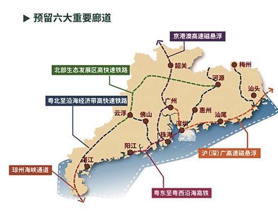 交通基础设施方面,规划提出将预留6大重要交通廊道,包括京港澳高速磁悬浮、沪(深)广高速磁悬浮、北部生态发展区高快速铁路、粤北至沿海经济带高快速铁路、琼州海峡通道、粤东至粤西沿海高铁。