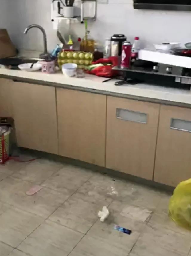 在视频中,可以看到房间地上有一块区域发黑,不知道是不是做饭的油渍没人清洗,还随处丢着垃圾。