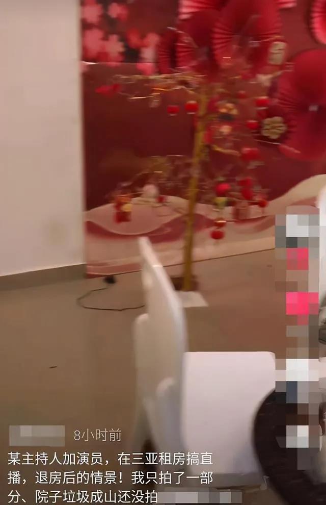 “某主持人加演员,在三亚租房搞直播,退房后的情景!我只拍了一部分,院子垃圾成山还没拍”。