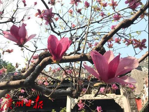 “木末芙蓉花,山中发红萼,涧户寂无人,纷纷开且落。”陈家祠退休馆长李卓祺告诉记者,大诗人王维笔下的木末胡蓉花,指的就是玉堂春。绚丽于早春枝头的玉堂春亦即紫玉兰,又名辛夷花,玉堂春花色有紫色和白色两种,每年都在春节前后盛放。根据植物史记载,象征着富贵吉祥的玉堂春,原产中国中部地区,栽培历史已有2500年,一度遍植中国江南的宫廷。 “历经近40年呵护,玉堂春如今已成为祠堂庭院内的‘报春花’,每年农历新年后,陈家祠的玉堂春最先开放。”李卓祺表示除了陈家祠 广州还有很多地方玉兰花正盛放 位于烈士陵园花卉馆草地上的玉兰花花开正艳,园内紫玉兰和白玉兰开的早的都已谢了,但还有很多含苞正待开放。白花如雪、红花如霞,满园关不住的“春色”引来众多市民竞相观赏拍摄。
